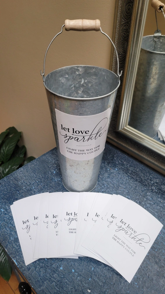 Selling a metal bucket with a wooden handle, size 4.75" dianeter x 9.75" height not incl handle. It comes with 20 cards (5x3 inxhed)that say 'Let Love Sparkle, Light the Way for the Happy Couple'. Perfect for a wedding or engagement party