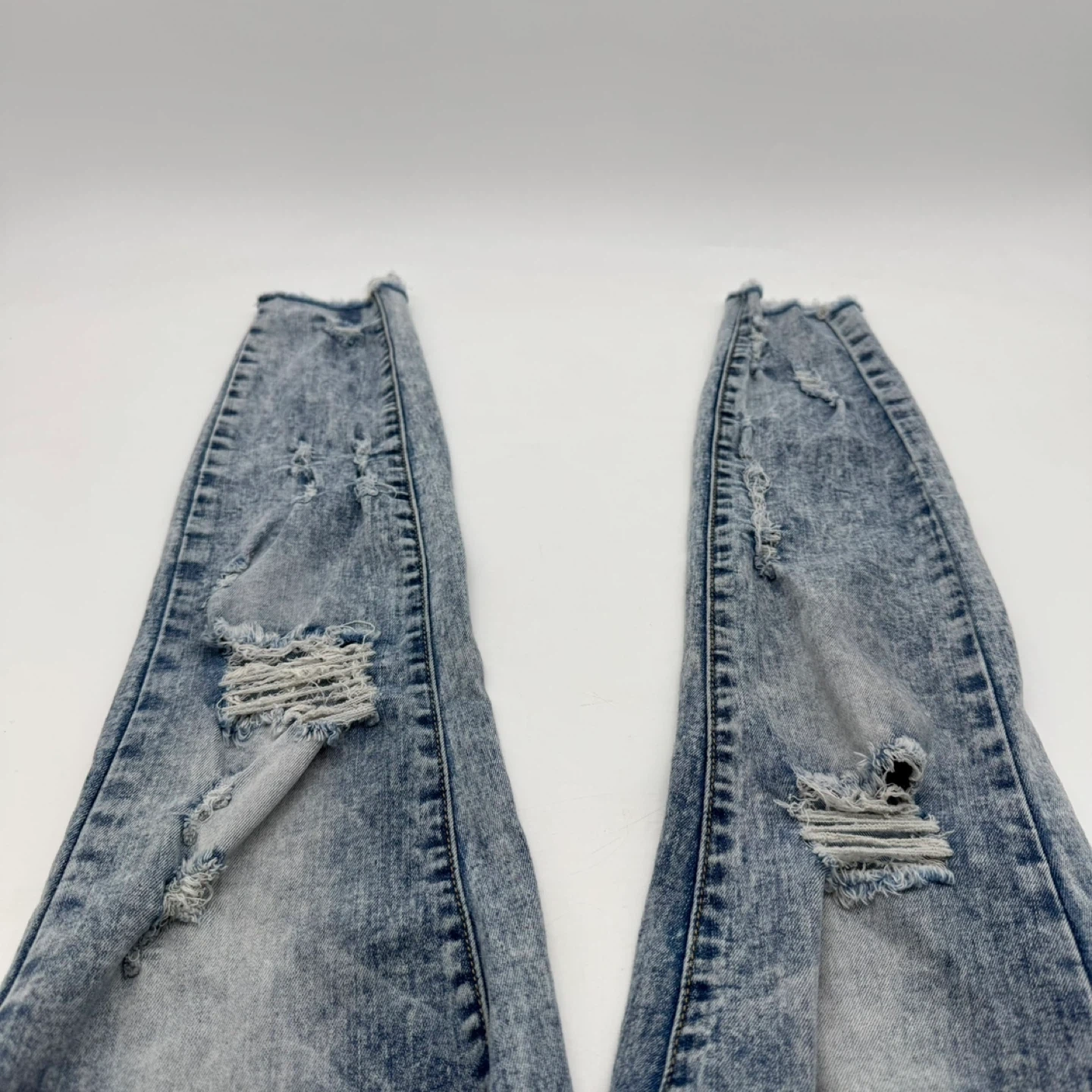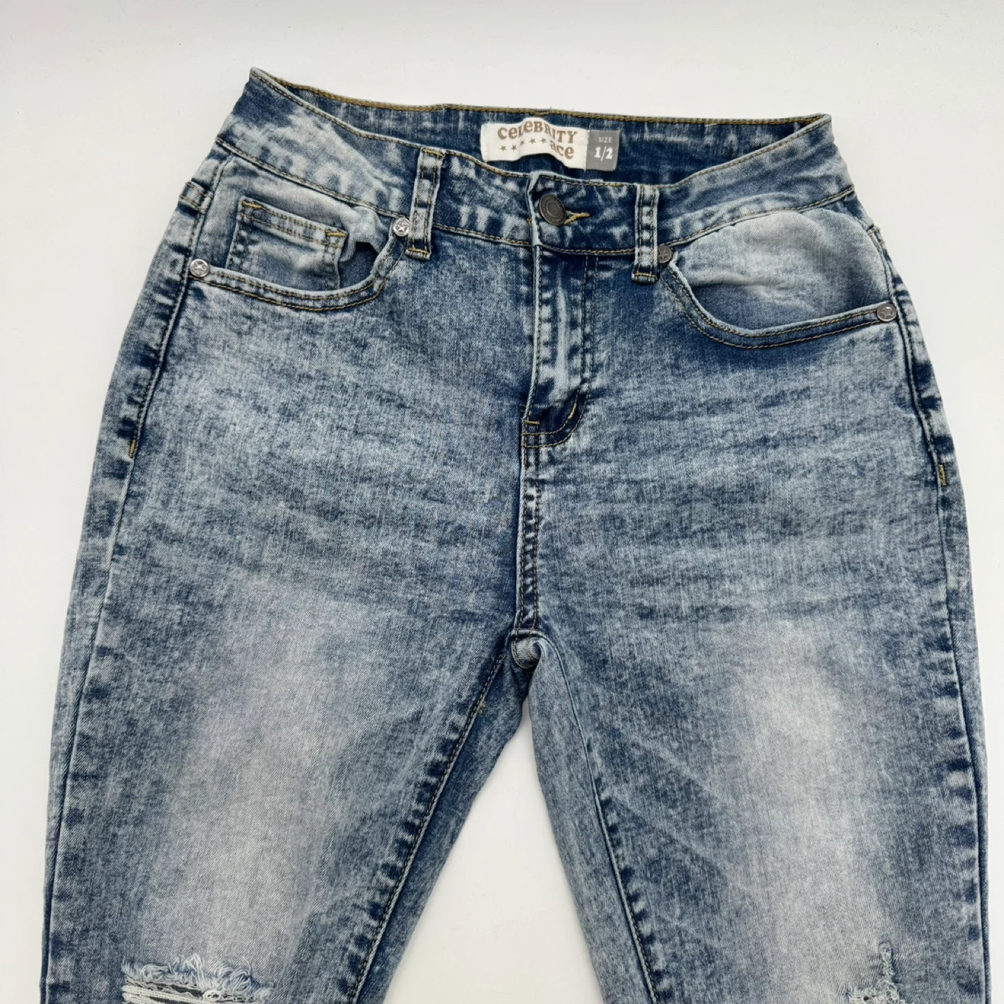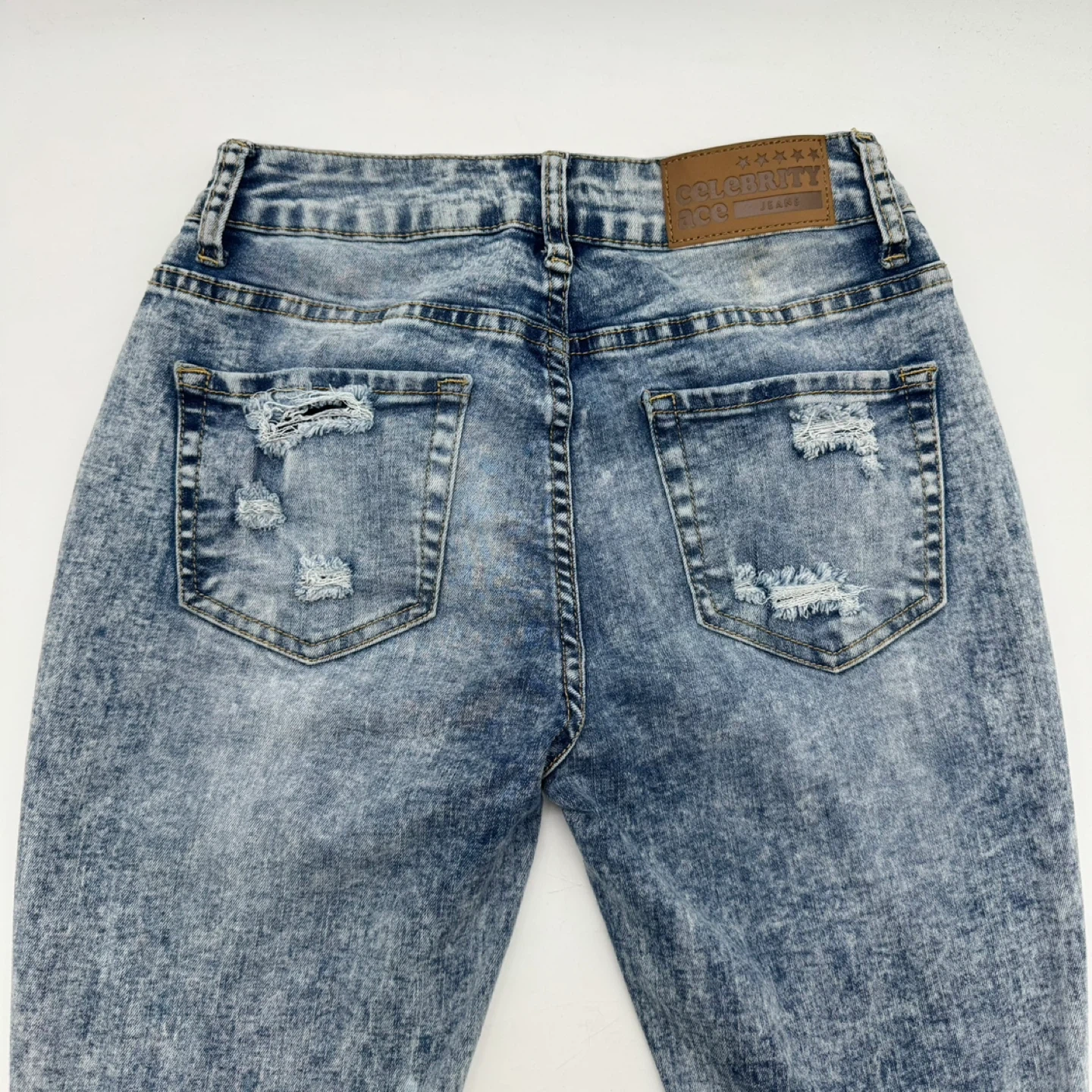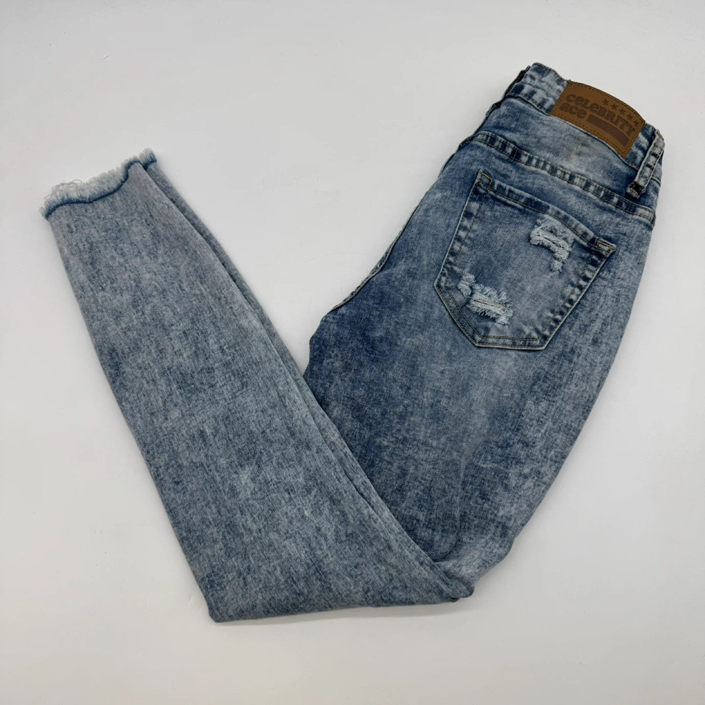 93Trendy light wash distressed skinny jeans by Celebrity Ace. Features zip closure, pockets, and two golden side stripes. Material: 80% cotton, 13.5% polyester, 4% rayon, 2.5% spandex. Size: US 1/2 (Approx. EU 32, UK 4). Pickup in North York Delivery available for extra CLJ104