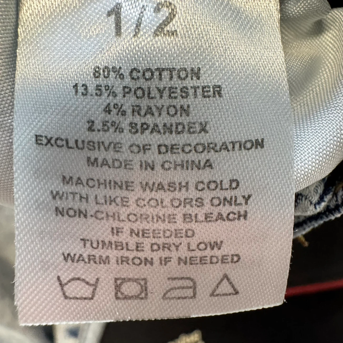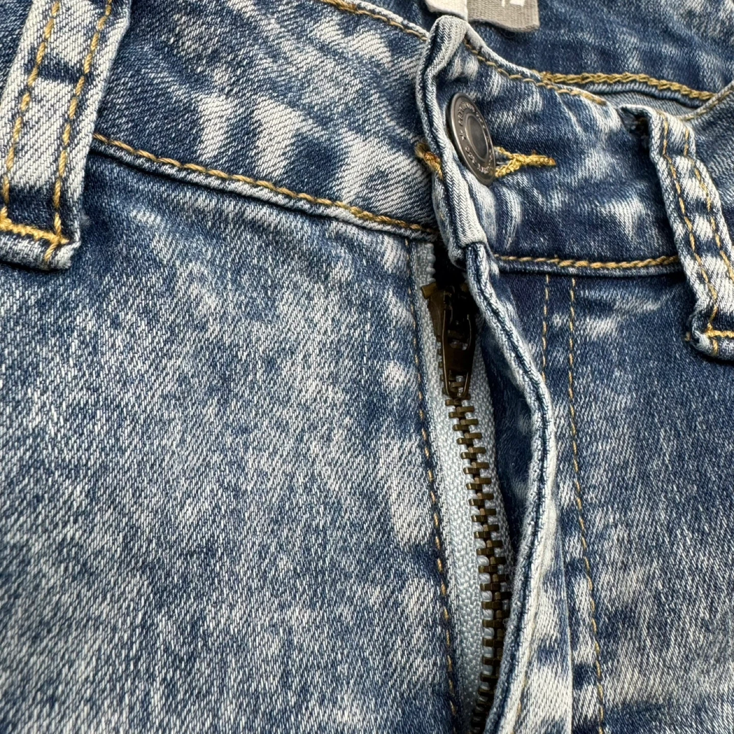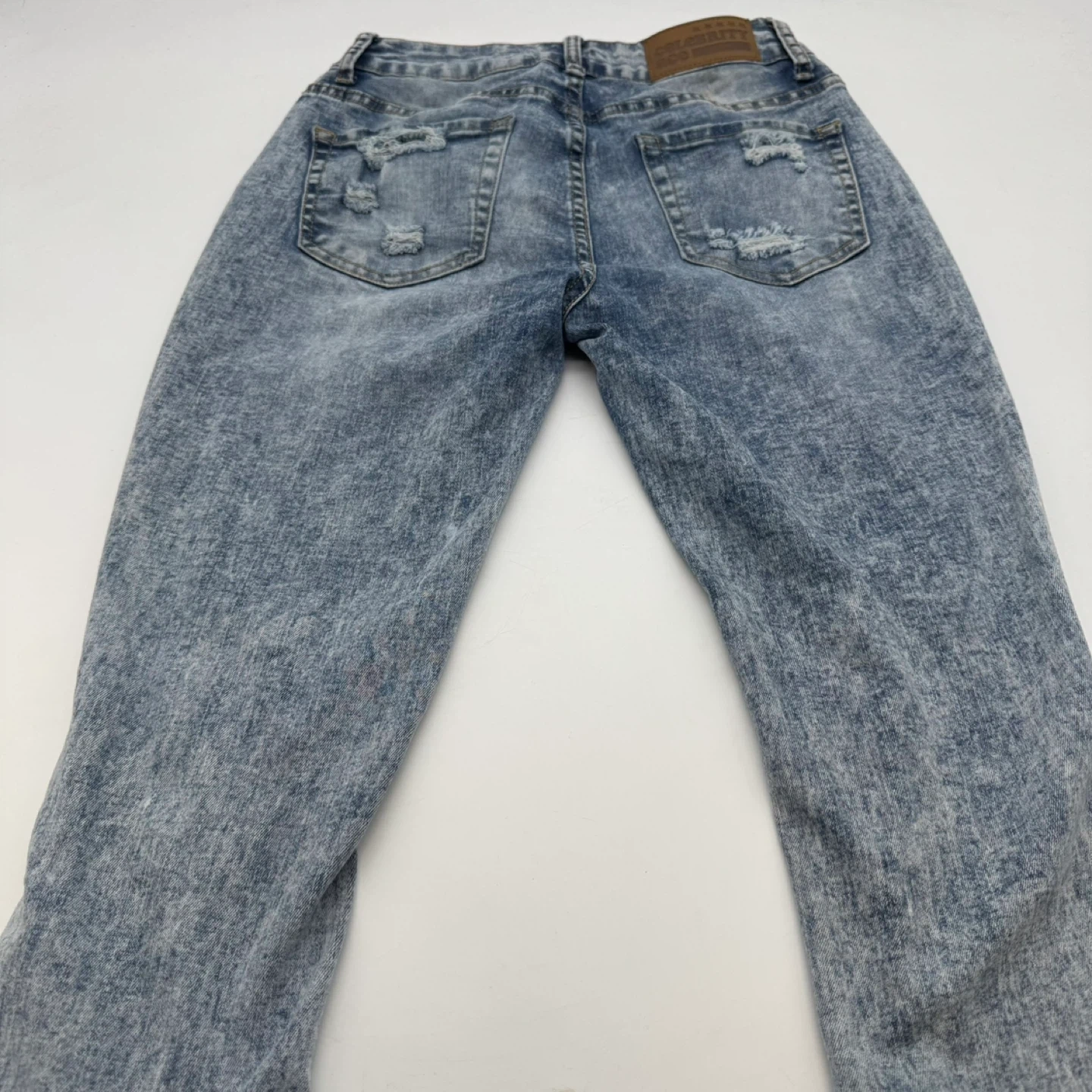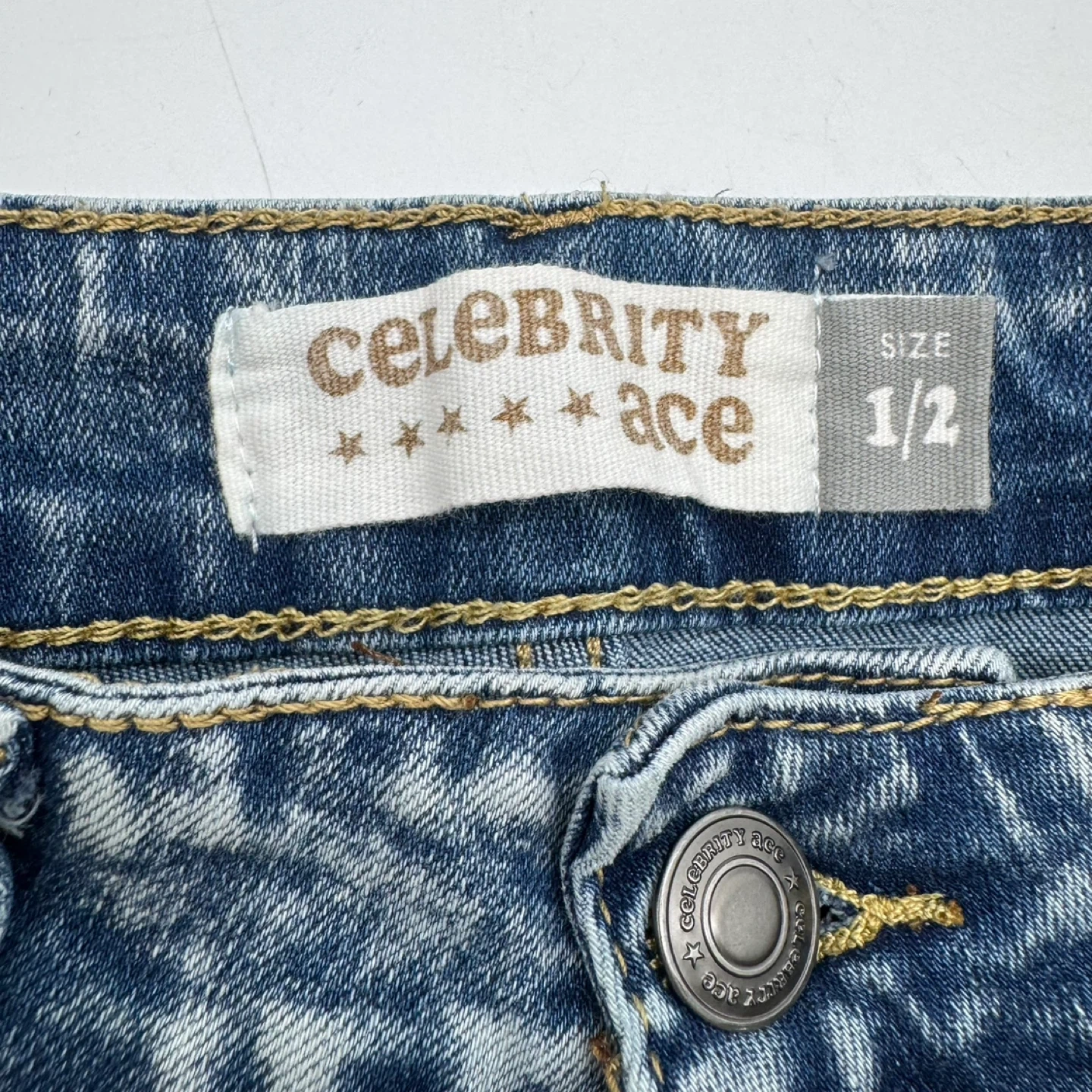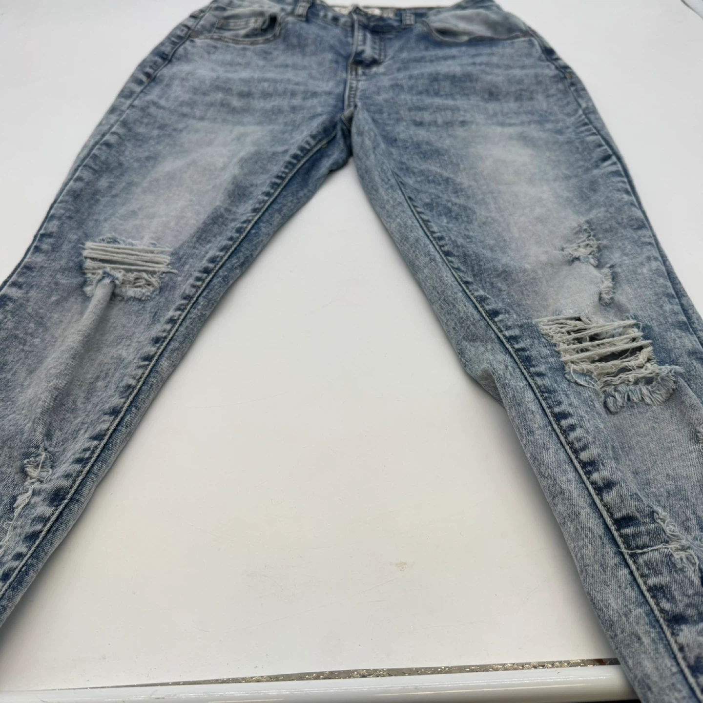 93Trendy light wash distressed skinny jeans by Celebrity Ace. Features zip closure, pockets, and two golden side stripes. Material: 80% cotton, 13.5% polyester, 4% rayon, 2.5% spandex. Size: US 1/2 (Approx. EU 32, UK 4). Pickup in North York Delivery available for extra CLJ104