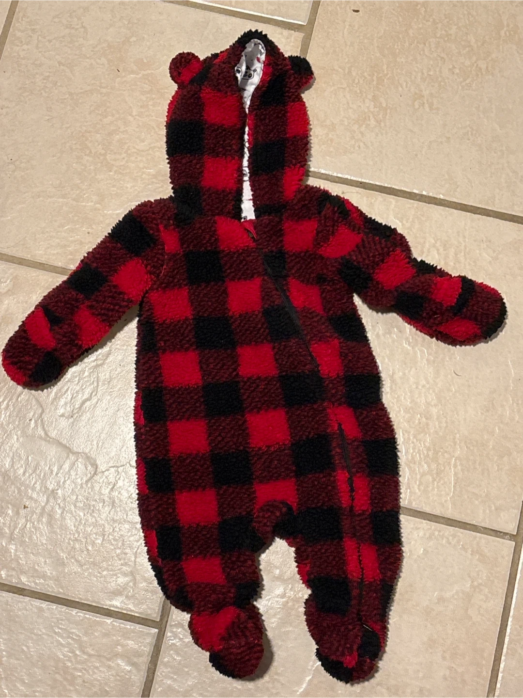 60Size 0-3m. Super cute and cozy baby onesie! It features a red and black plaid pattern and adorable bear ears on the hood. Perfect for keeping your little one warm and snug during the colder months