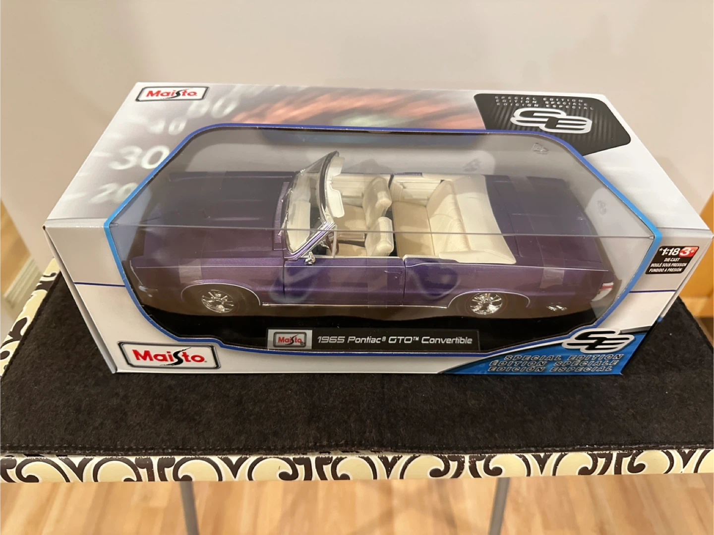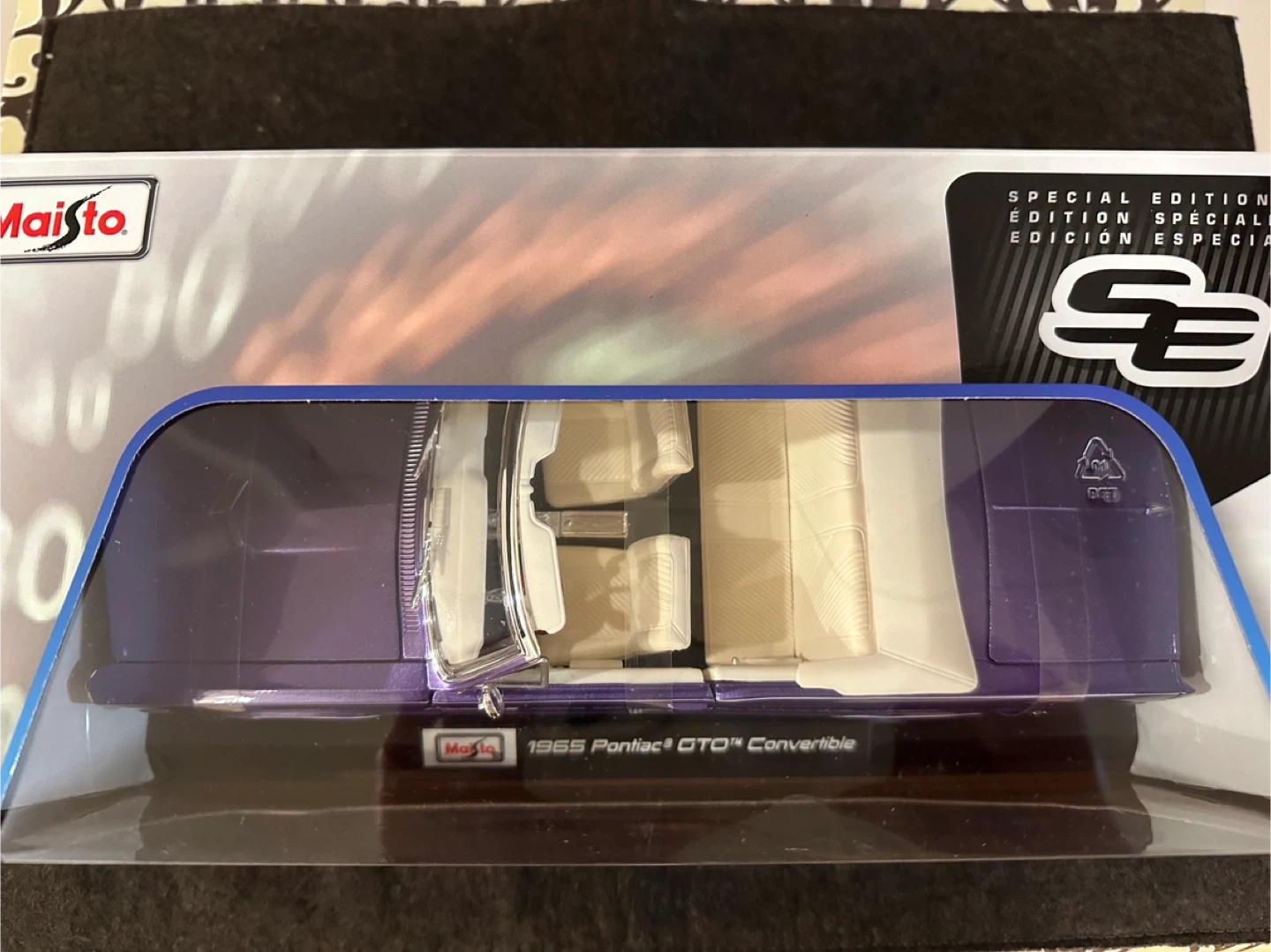 60Selling a Maisto 1965 Pontiac GTO Convertible, still in its original packaging! It's a 1:18 diecast scale model, perfect for collectors or as a display piece. The car is a beautiful purple colour with a cream interior. The box is included and in great condition. Doors , hood , trunk open