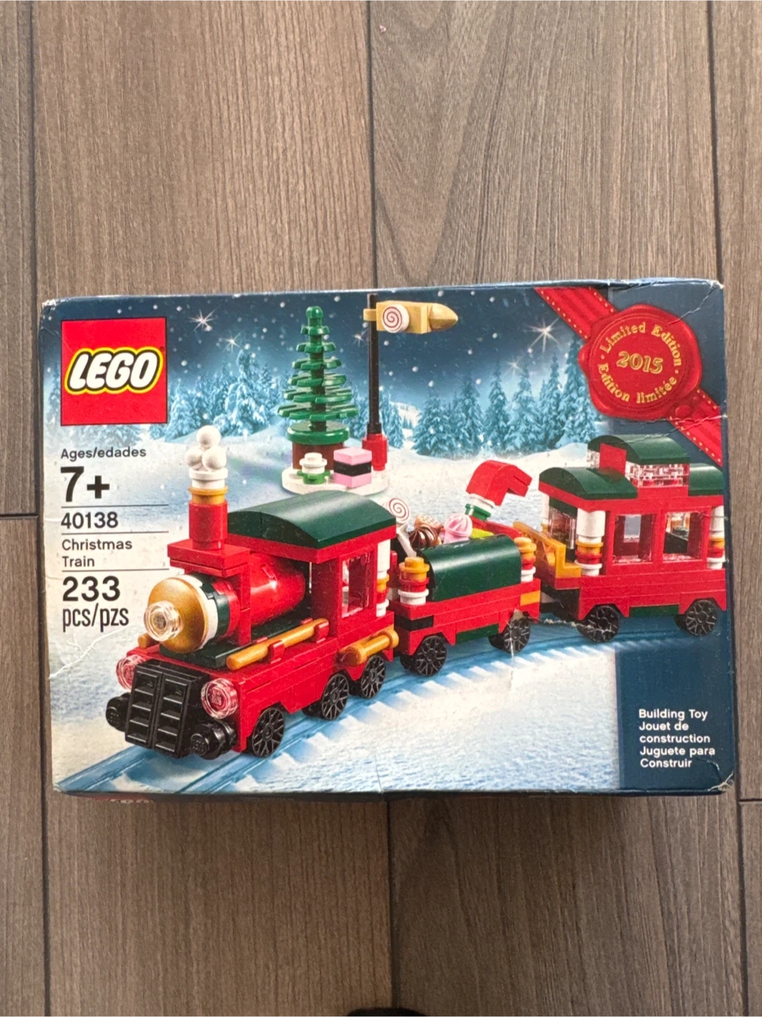 Selling a LEGO Christmas Train set, model number 40138. It's a limited edition from 2015. Never opened! The box is included and the set is for ages 7+. It contains 233 pieces to build a festive holiday train!