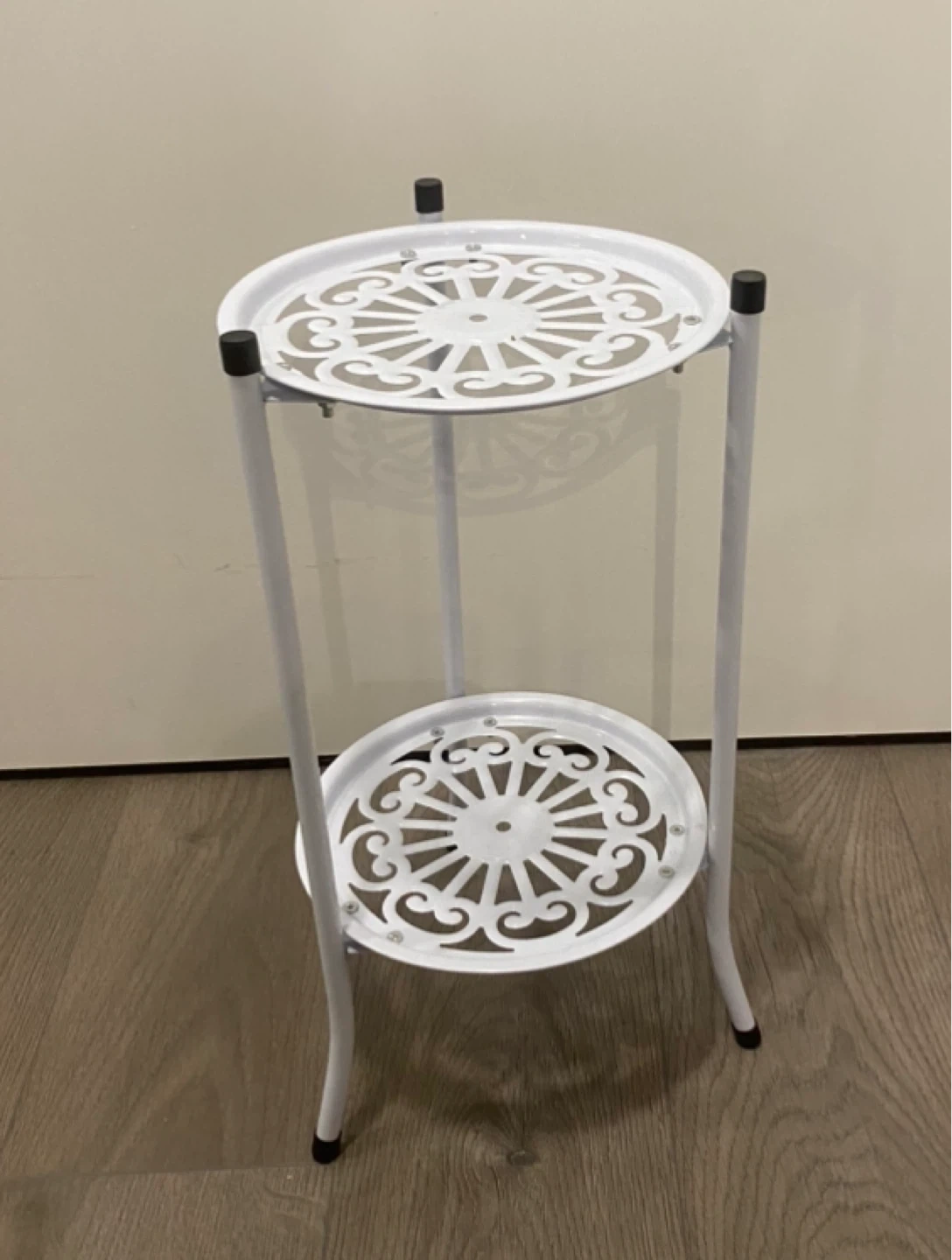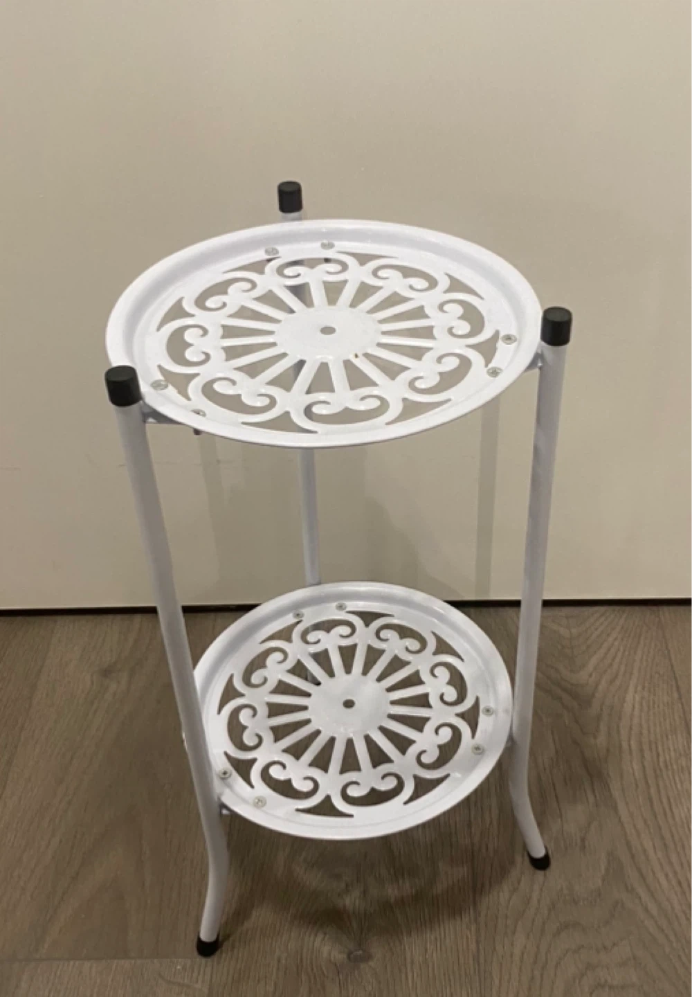 992Here's a cute two-tiered plant stand, perfect for adding a touch of elegance to your home or balcony! It's a lovely white colour and in great condition. It would look great with some plants or other decorative items on it
