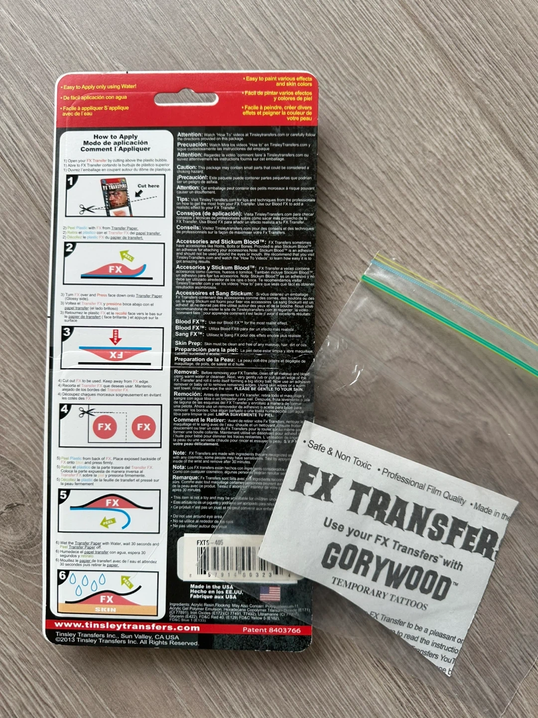 Get ready for Halloween with these Hollywood film quality FX Transfers! They're easy to apply using only water. Safe & non-toxic. Made in the USA by Tinsley Transfers.
