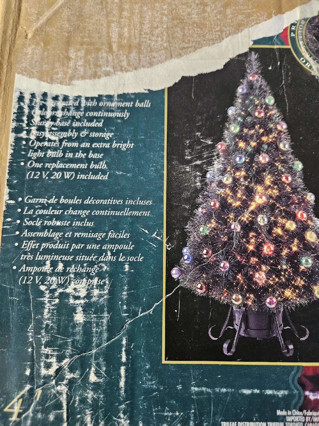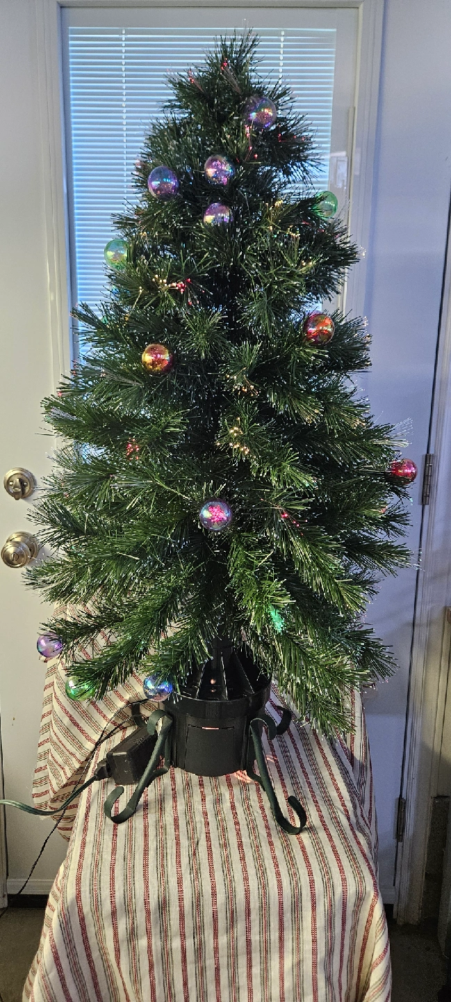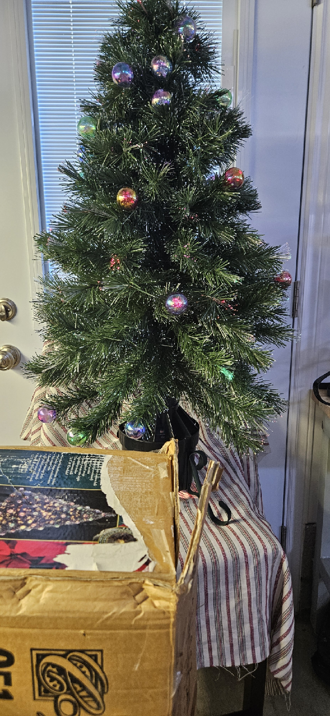 Selling a pre-lit Christmas tree that comes with ornament balls. The colour changes continuously. It has an easy assembly and storage and operates from an extra bright light bulb in the base. One replacement bulb (12 V, 20 W) is included. Comes with original box