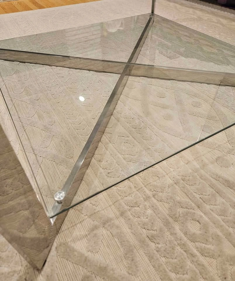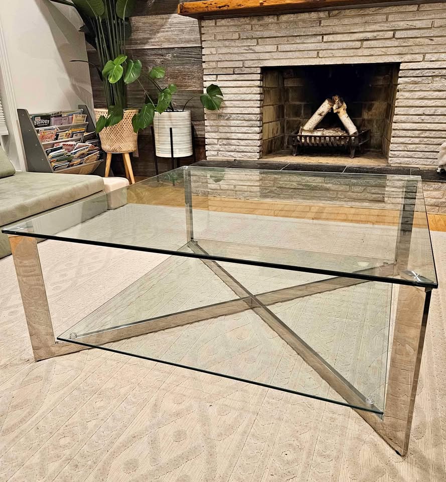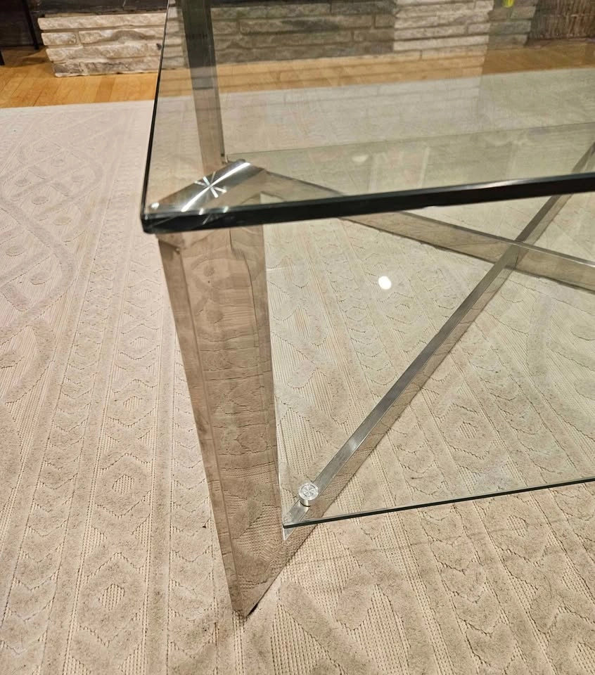 Stunning square glass coffee table with stainless steel frame. Bottom glass shelf for extra storage. The perfect centerpiece for your living room.