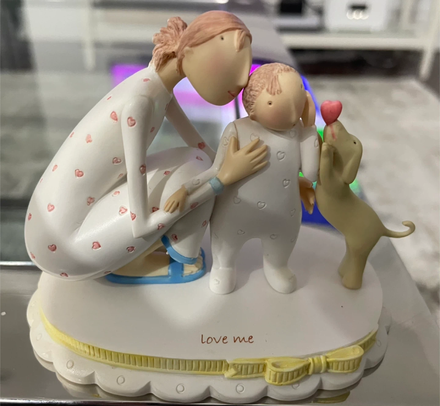 I'm selling a lovely Demdaco From Above figurine titled "Love Me"! It depicts a mother, child, and dog. The figurine is in great shape and would make a wonderful addition to any collection