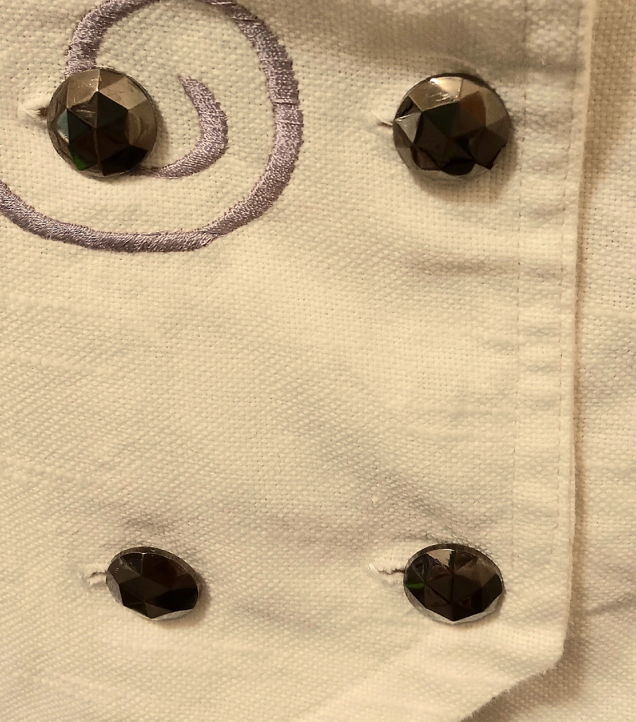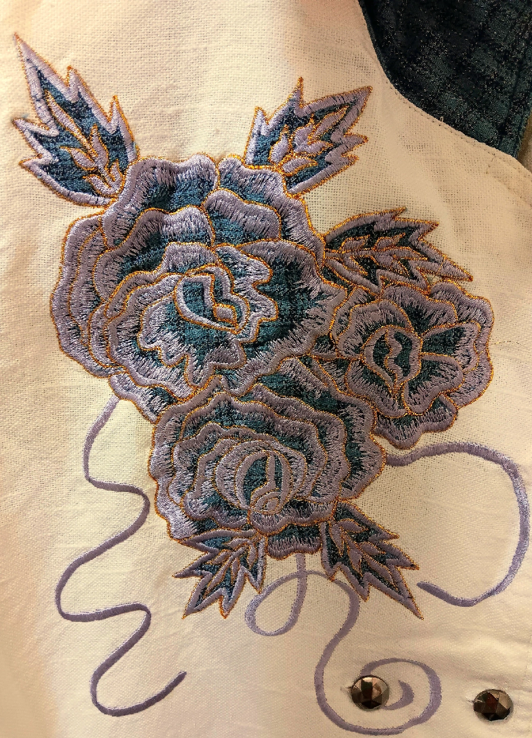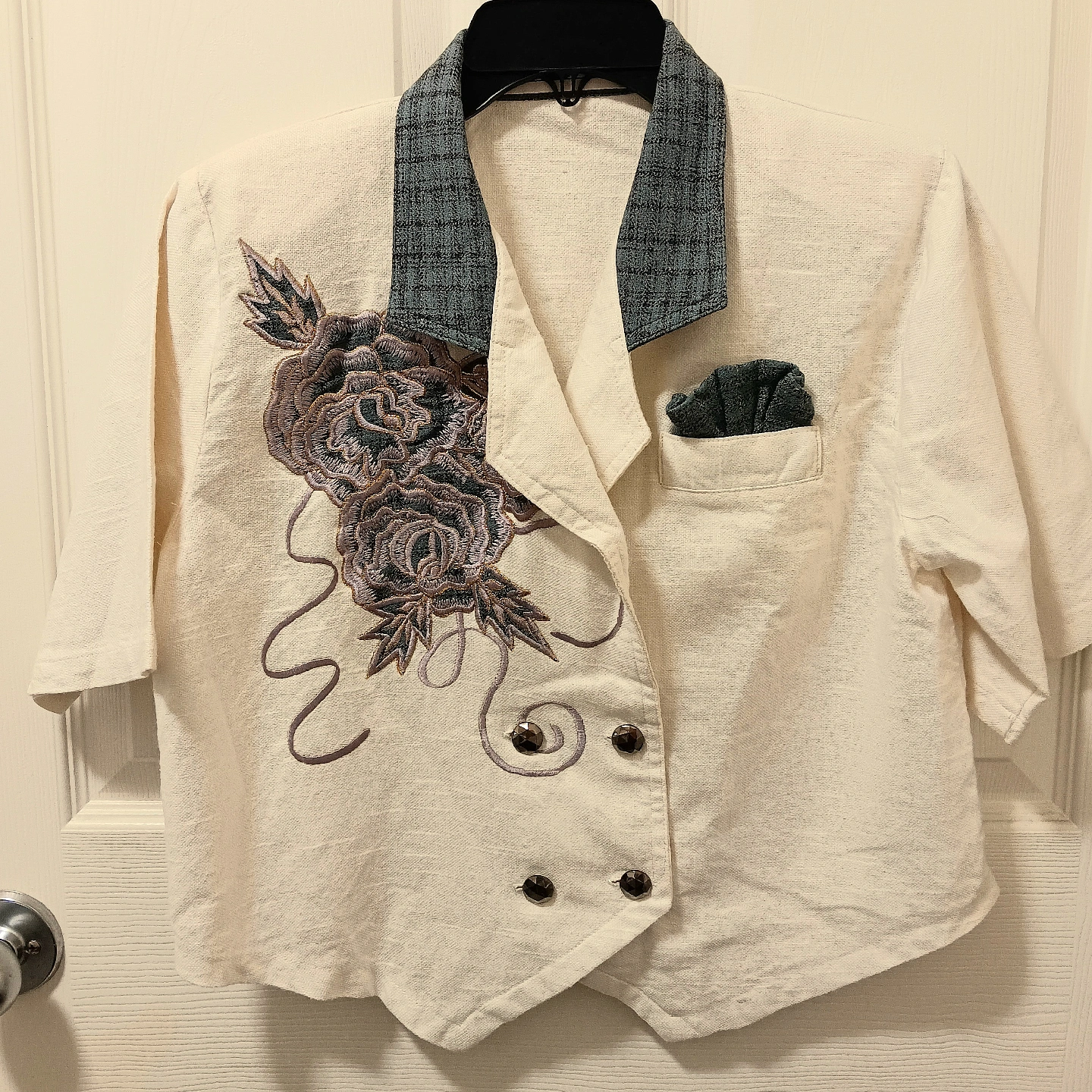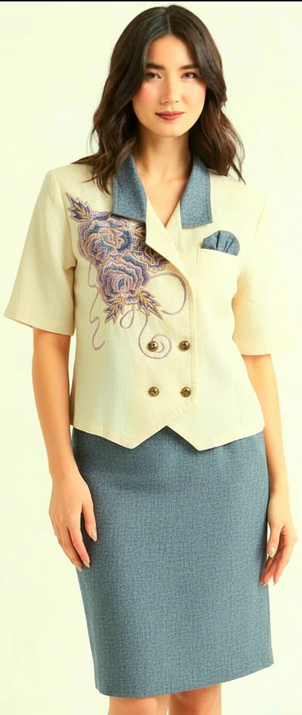 This is a vintage two-piece skirt suit, perfect for adding a touch of retro flair to your wardrobe. The set features a unique jacket with an embroidered floral design and decorative buttons, paired with a matching pencil skirt. The fabric has a textured feel, adding to its vintage charm. This suit is in excellent condition, ready to wear for any occasion where you want to make a statement.