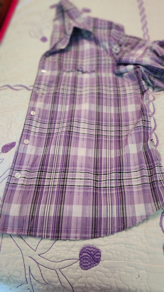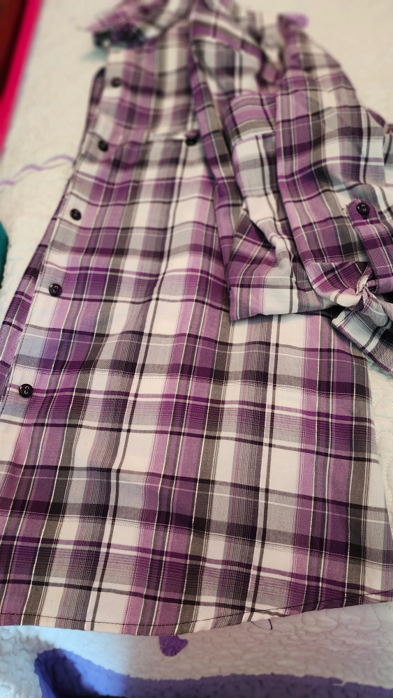 10Here's a cute purple plaid button-up shirt! It's perfect for layering or wearing on its own. The plaid pattern is a mix of purple, white, and black. It's in great condition and ready for a new home
