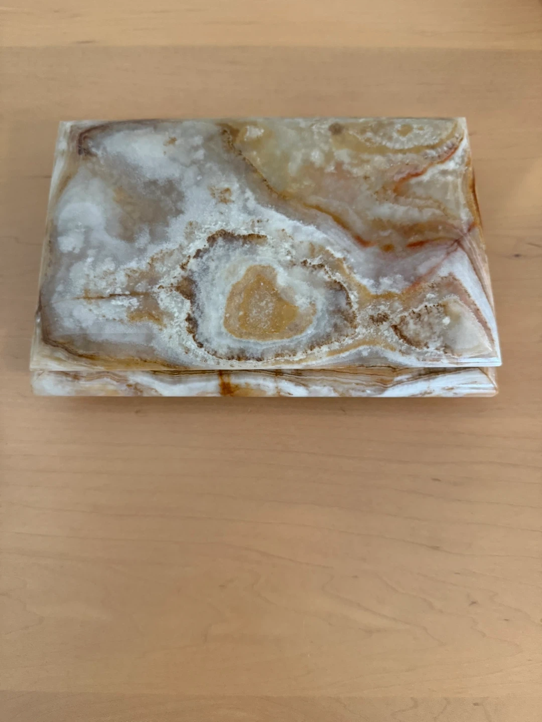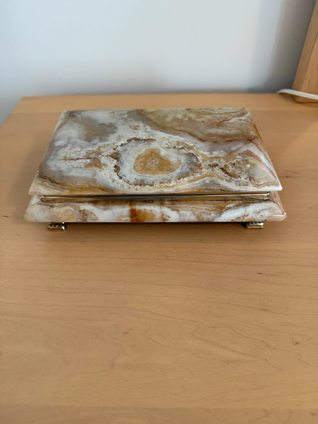 Selling a lovely marble jewellery/trinket box. It has a red velvet interior and a gold trim inside. Has 4 metal legs. Perfect for storing your precious items!