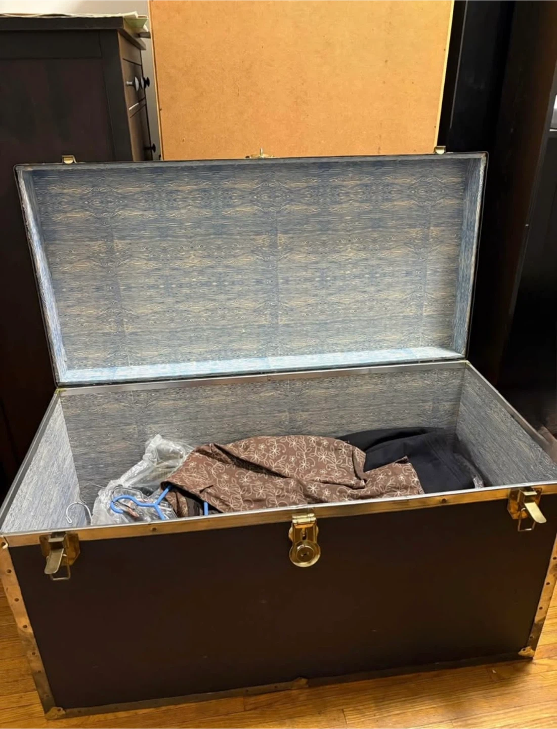 Organize your space with this charming, versatile storage trunk! This piece is perfect for stowing away blankets, toys, or seasonal items, adding a touch of vintage flair to any room. Given its age, this used trunk has some wear and tear, which only adds to its character. Ready to give your home a stylish storage solution?