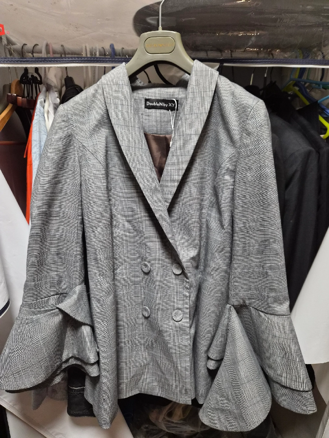 Here's a stylish plaid blazer from DoubleNby XY! It features a unique design with flared sleeves and a double-breasted front. Perfect for adding a touch of sophistication to any outfit