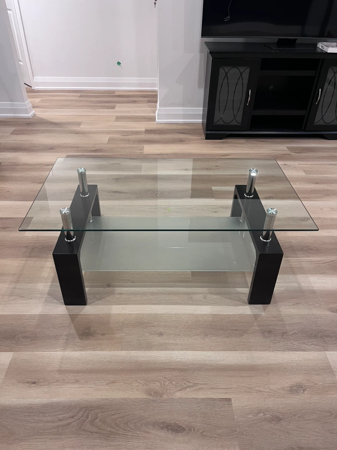 Selling a glass coffee table with a sleek black frame! It's in great shape and would look lovely in any living room. It features a clear glass top and a lower shelf, perfect for storing books or decor