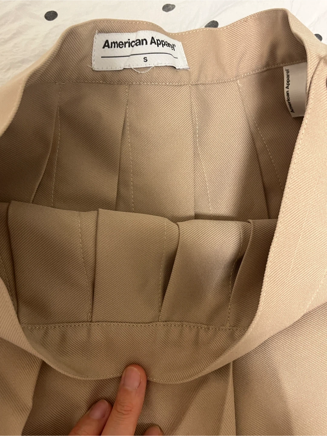 Selling a gently used American Apparel pleated skirt in a lovely tan colour! It's a size small and in great condition.