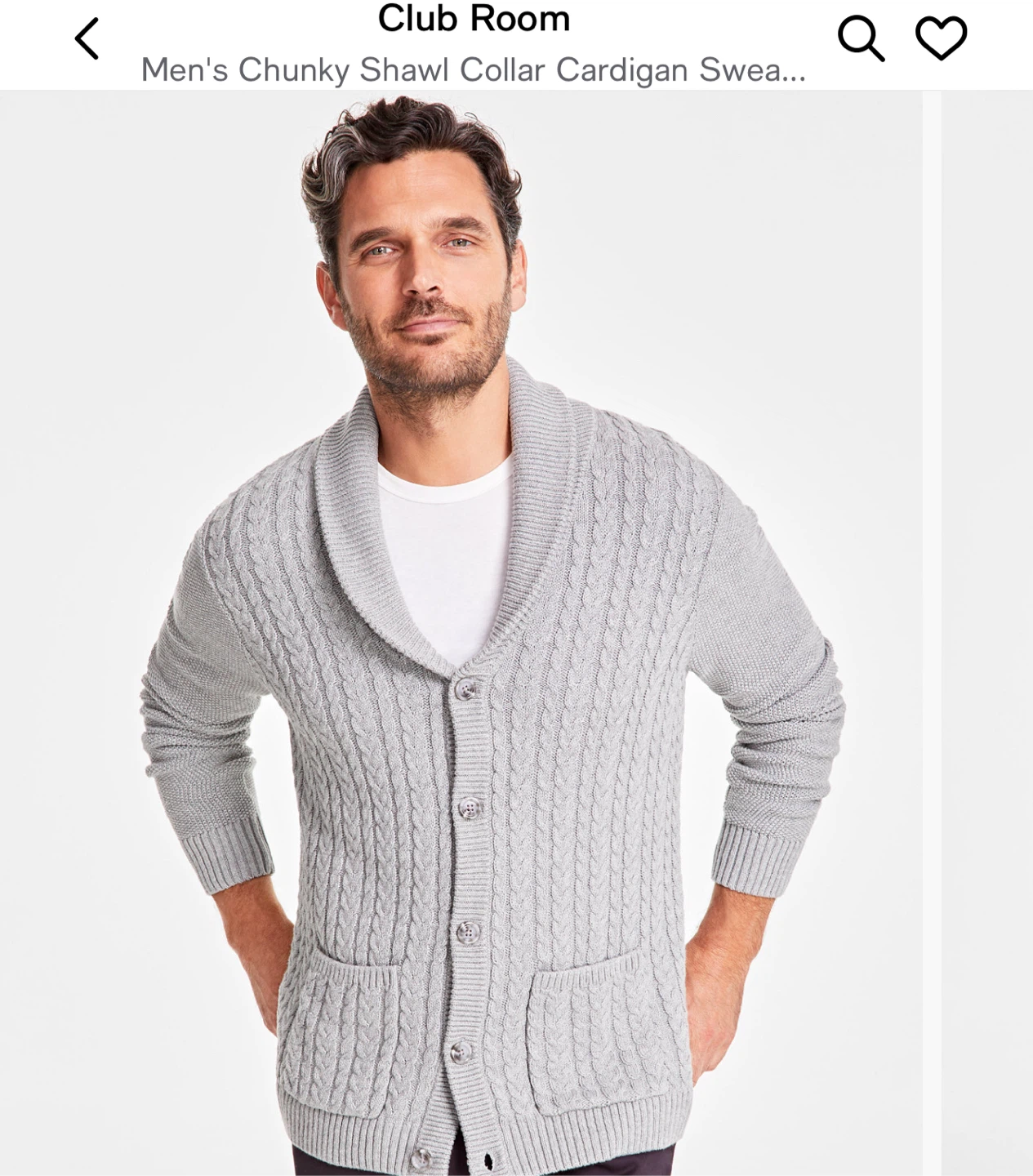 Selling a Club Room men's cardigan in size medium. It's a chunky knit with a shawl collar and cable knit detailing. The color is a versatile gray. Perfect for layering!