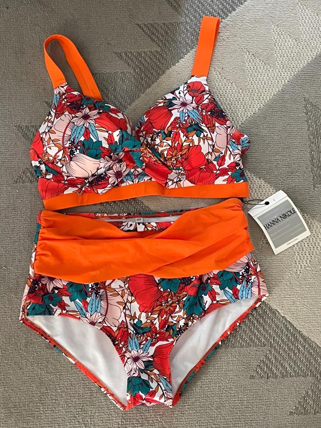 Selling a Hanna Nikole bikini swimsuit in size 14W. It features a vibrant floral print with orange accents. Perfect for the summer! Size large Brand new never worn