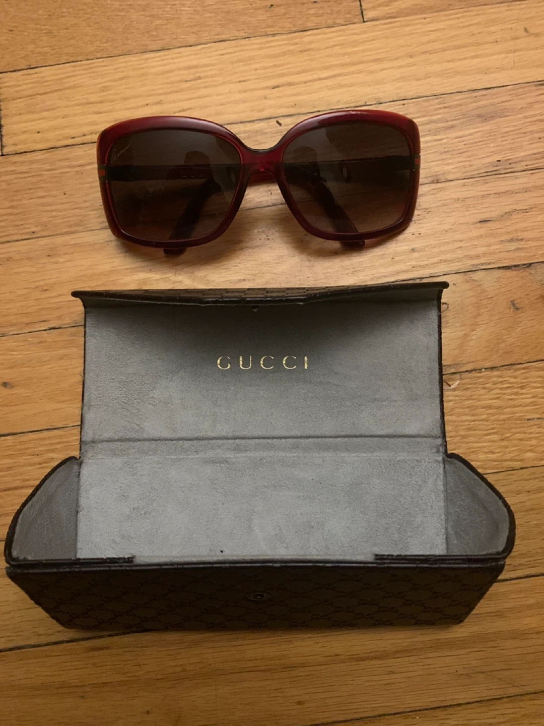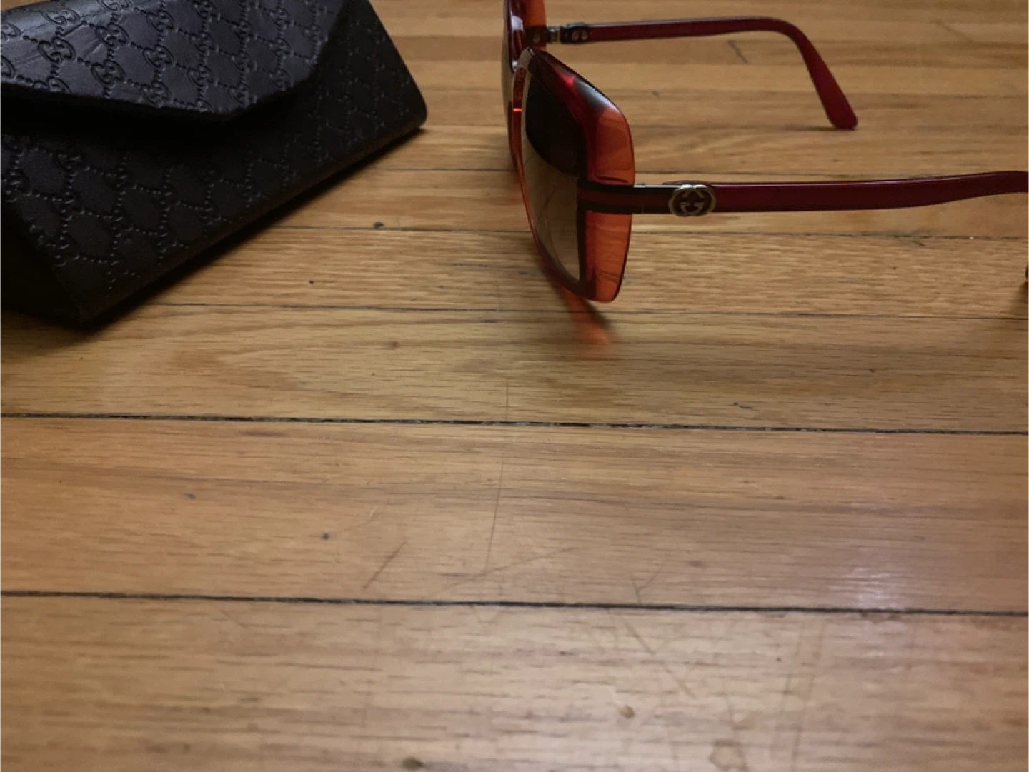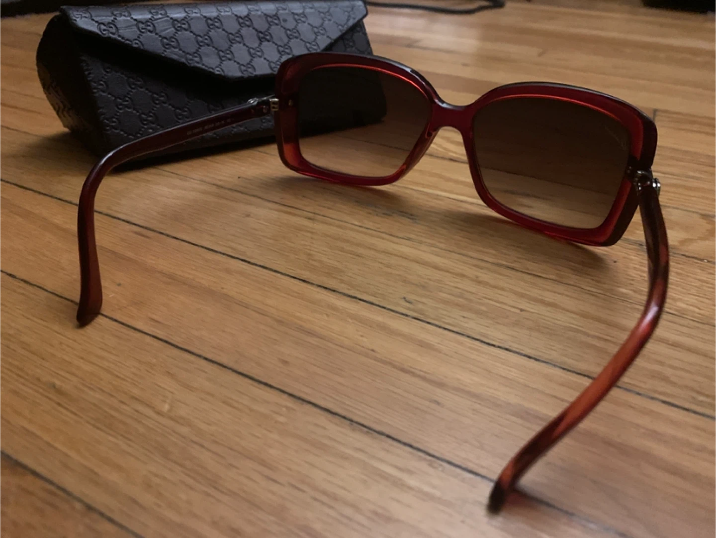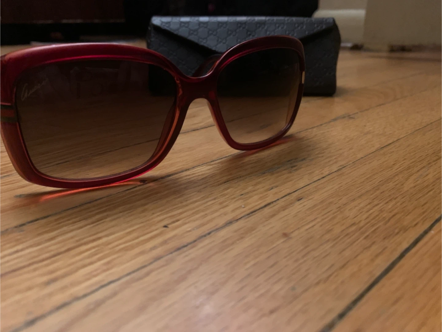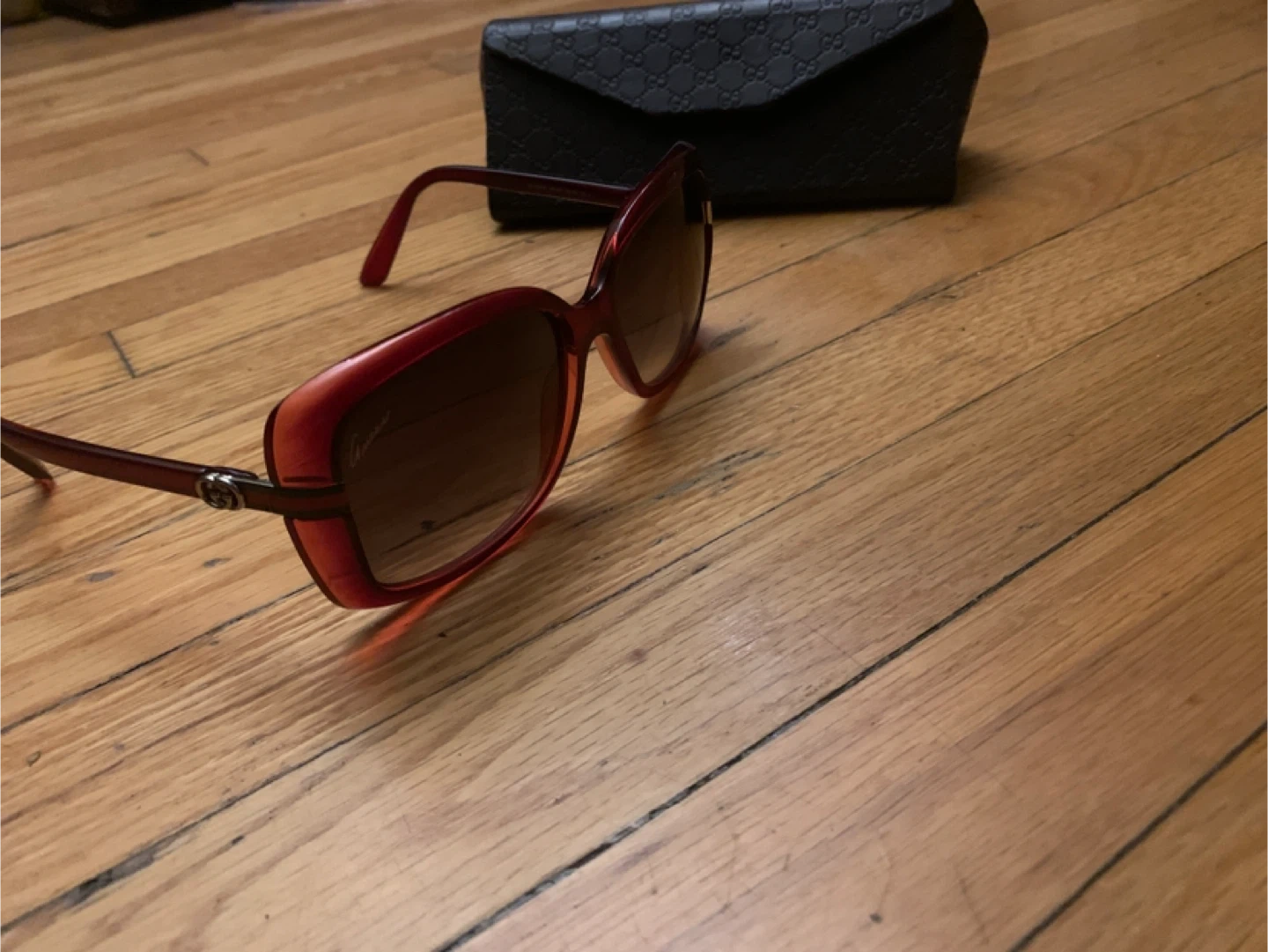 Selling a pair of Gucci sunglasses with a red frame and brown gradient lenses. Comes with the original Gucci case, which has a nice textured pattern. These sunglasses are in great condition and ready for a new home!
