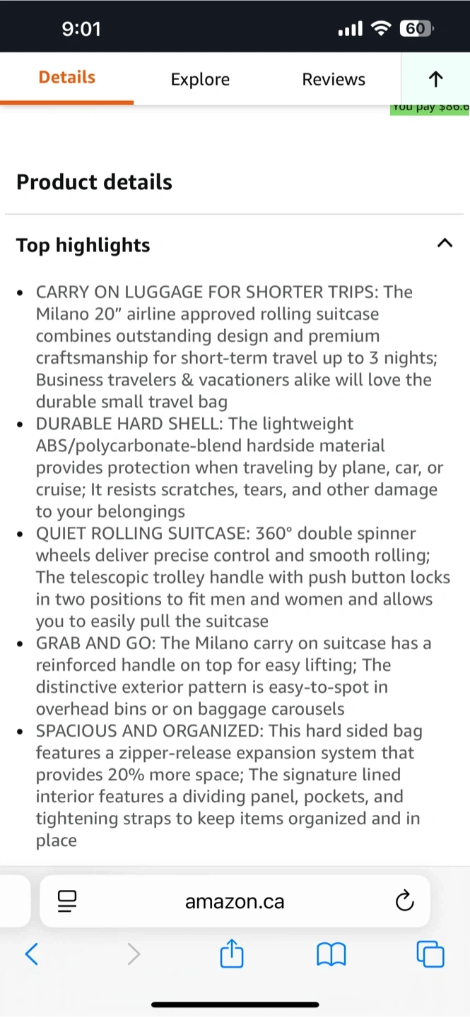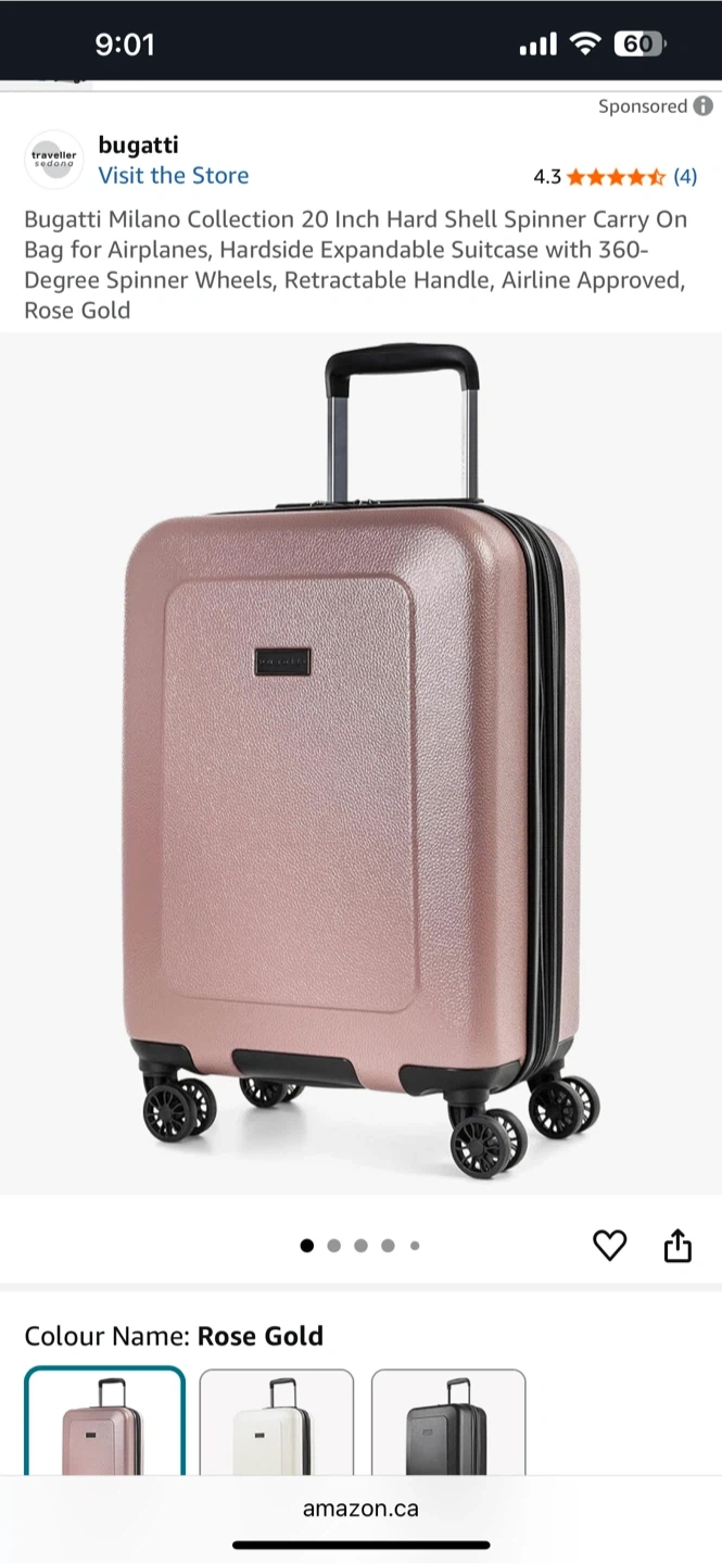 Looking to sell a Bugatti Milano Collection 20-inch hard shell carry-on bag! It's perfect for short trips, with outstanding design and premium craftsmanship. The lightweight ABS/polycarbonate-blend hard shell provides great protection. It also features quiet 360-degree spinner wheels and a telescopic trolley handle. The signature lined interior features a zipper-release expansion system for 20% more space. Lightly used but still in good condition. Paid $170.00 plus tax Asking $50.00 obo Must be able to pick up.