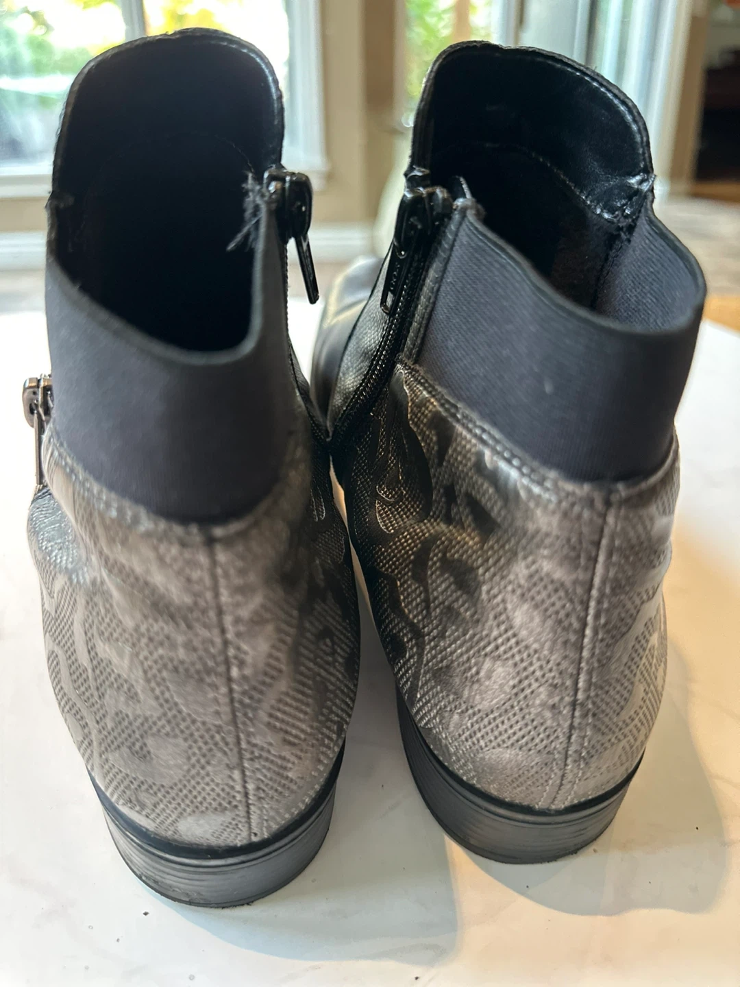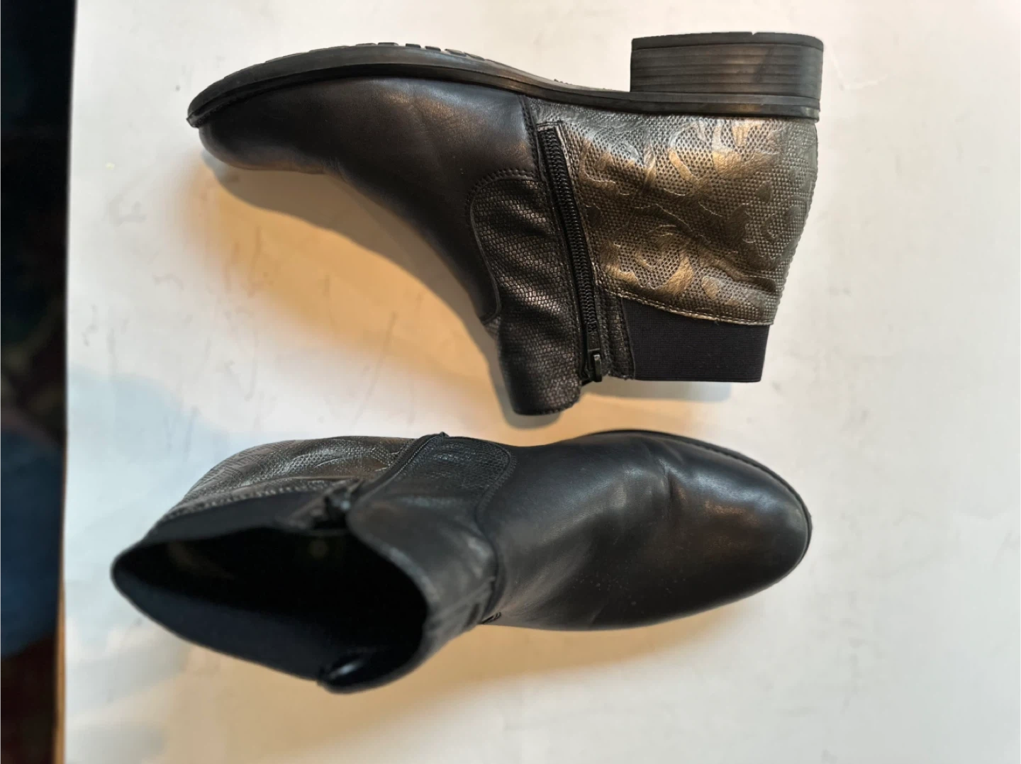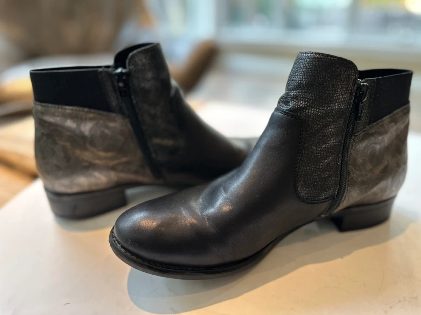 65REMONTE leather ankle boots. In very good preloved condition. Size EUR 40/ US 9-9.5 They feature a side zipper and a unique metallic textured panel. These shoes have been meticulously cleaned and sanitized. From a smoke free, pet free home. Pick up in Alta Vista.