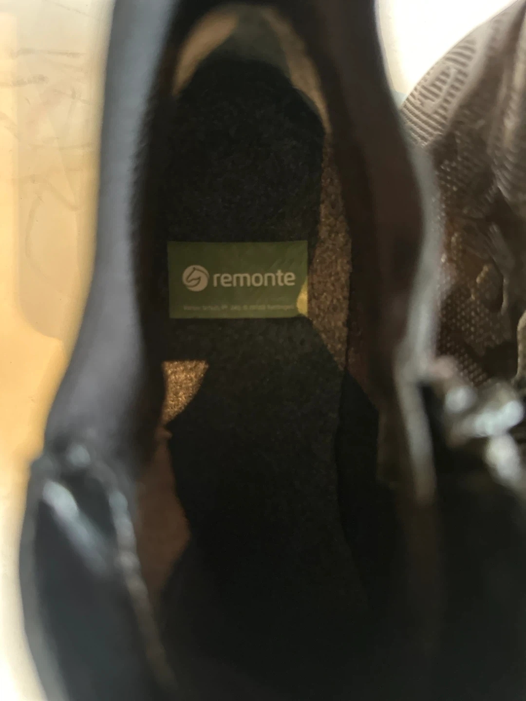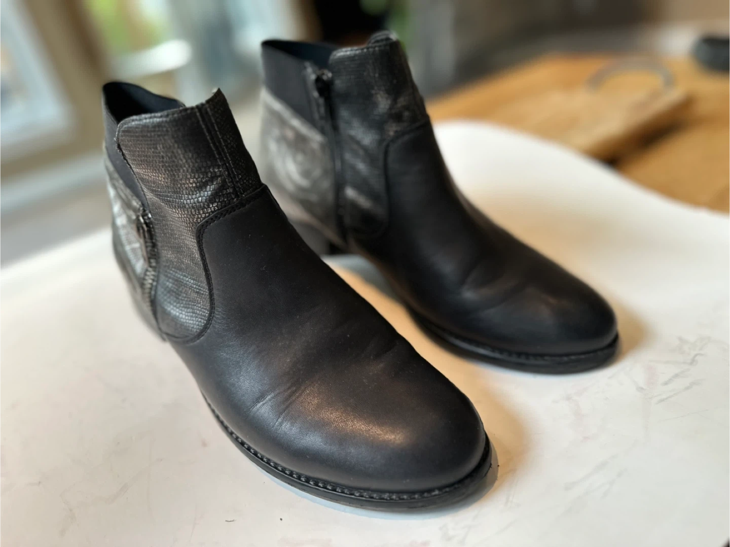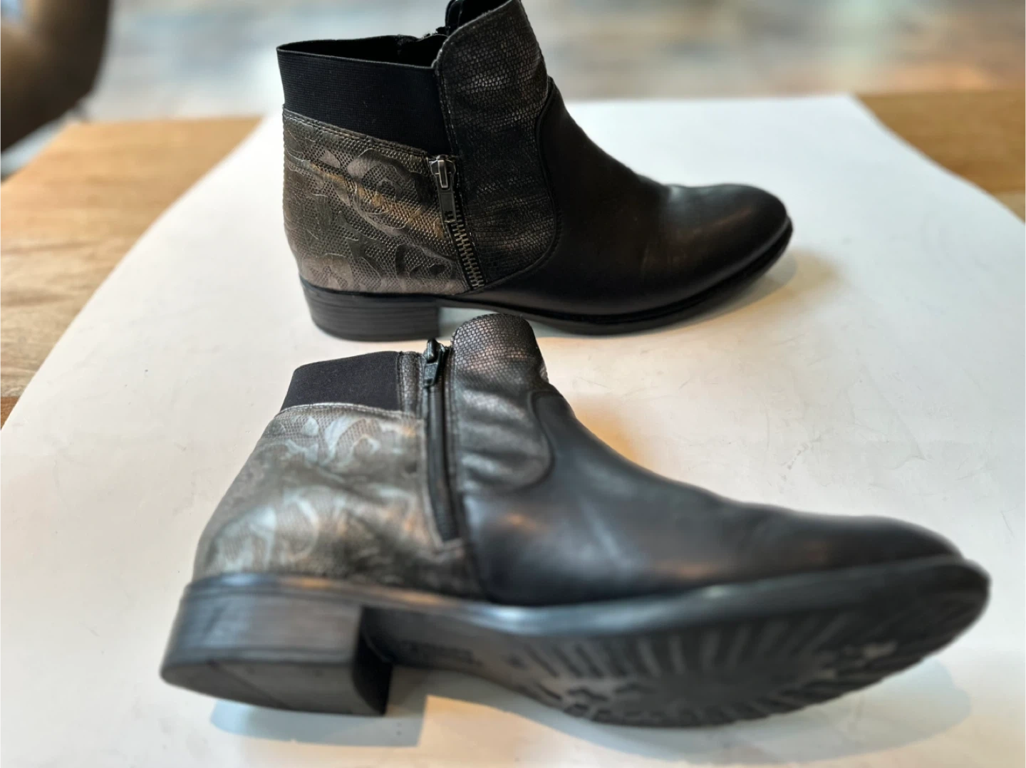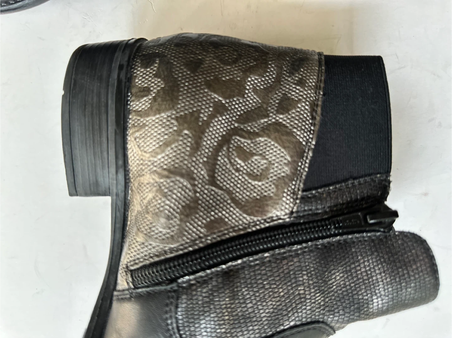 65REMONTE leather ankle boots. In very good preloved condition. Size EUR 40/ US 9-9.5 They feature a side zipper and a unique metallic textured panel. These shoes have been meticulously cleaned and sanitized. From a smoke free, pet free home. Pick up in Alta Vista.