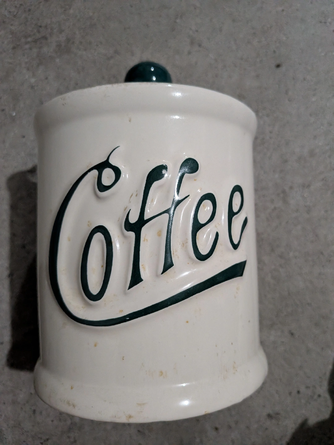 1000+Selling a ceramic coffee canister. It's white with a dark green lid and lettering that spells out 'Coffee'. It's a cute way to store your coffee beans or grounds!