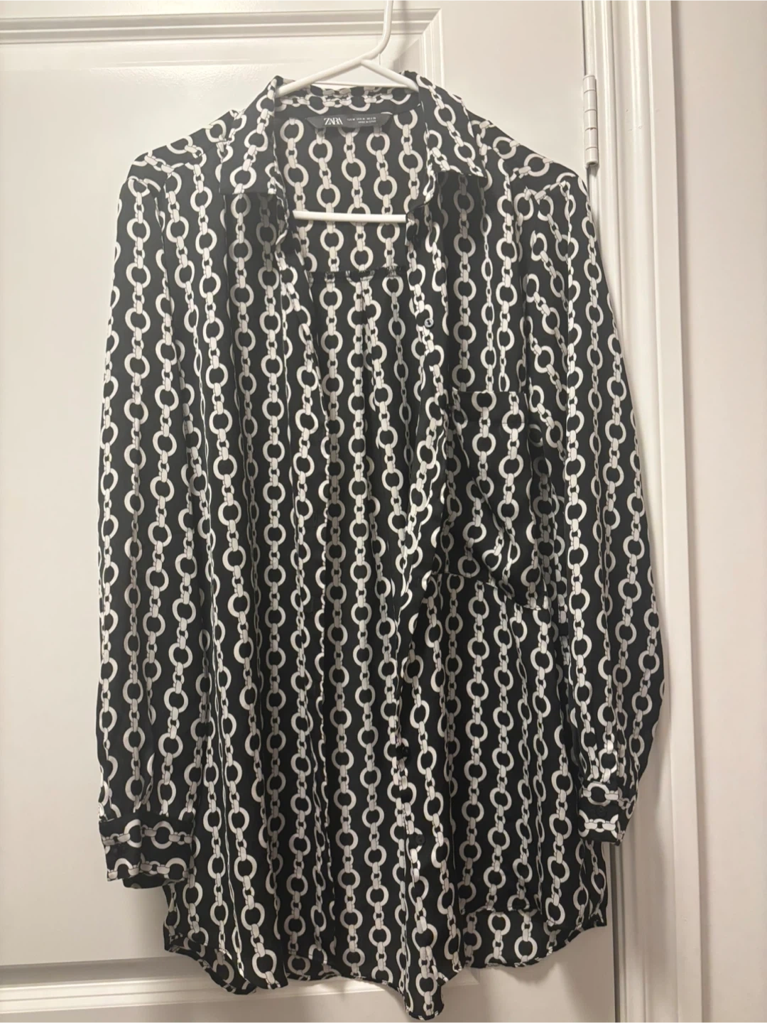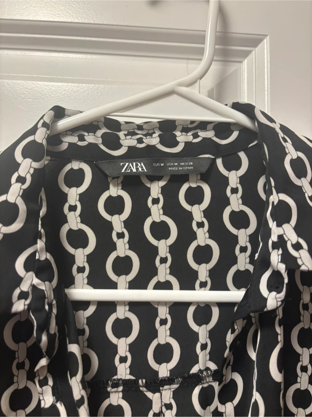 Selling a Zara blouse with a unique chain print! It's a size medium and in great condition. The blouse features a stylish black and white pattern that's sure to turn heads. Perfect for adding a touch of elegance to any outfit!