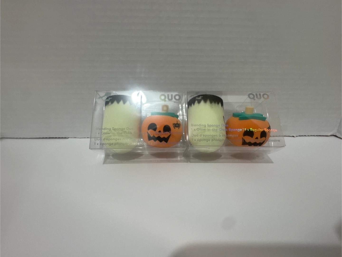 78Selling a new QUO Blending Sponge Duo, perfect for Halloween! This set includes one glow-in-the-dark sponge and one regular sponge, shaped like a Frankenstein head and a pumpkin. Great for applying your makeup with a festive touch 2 left