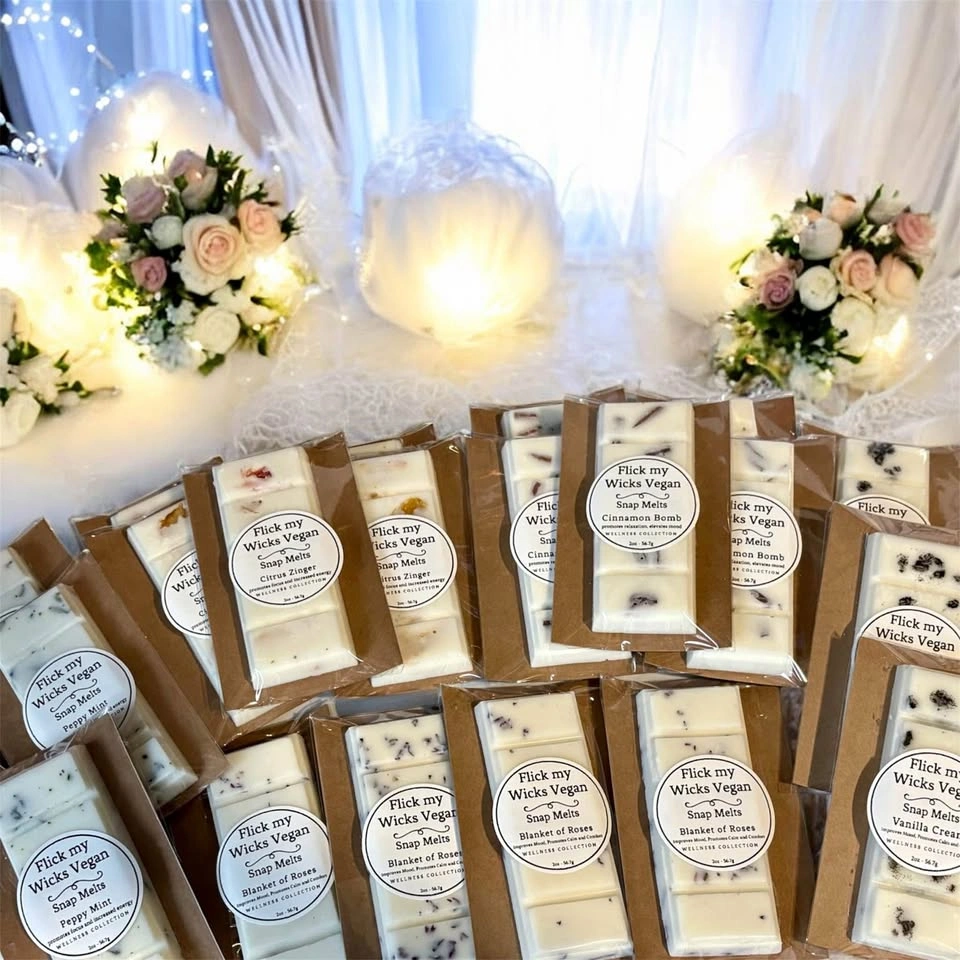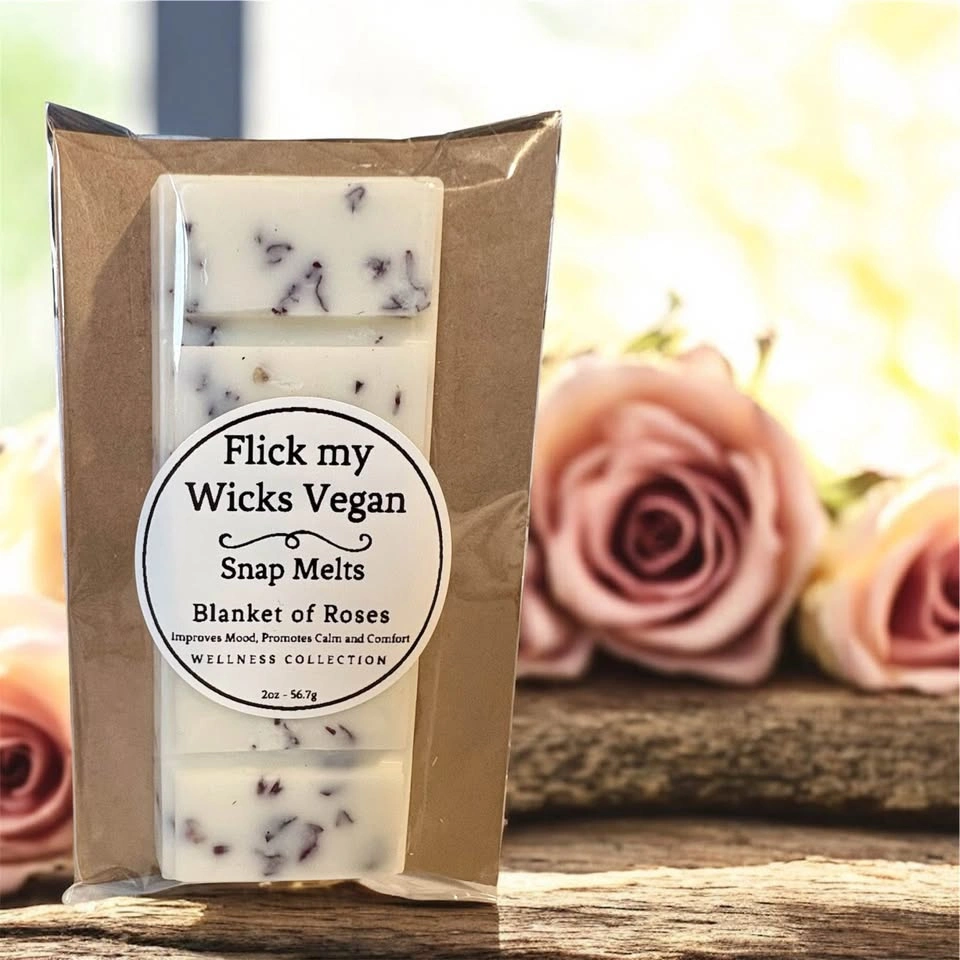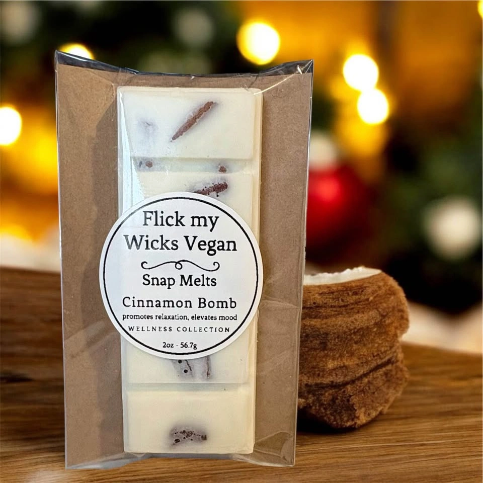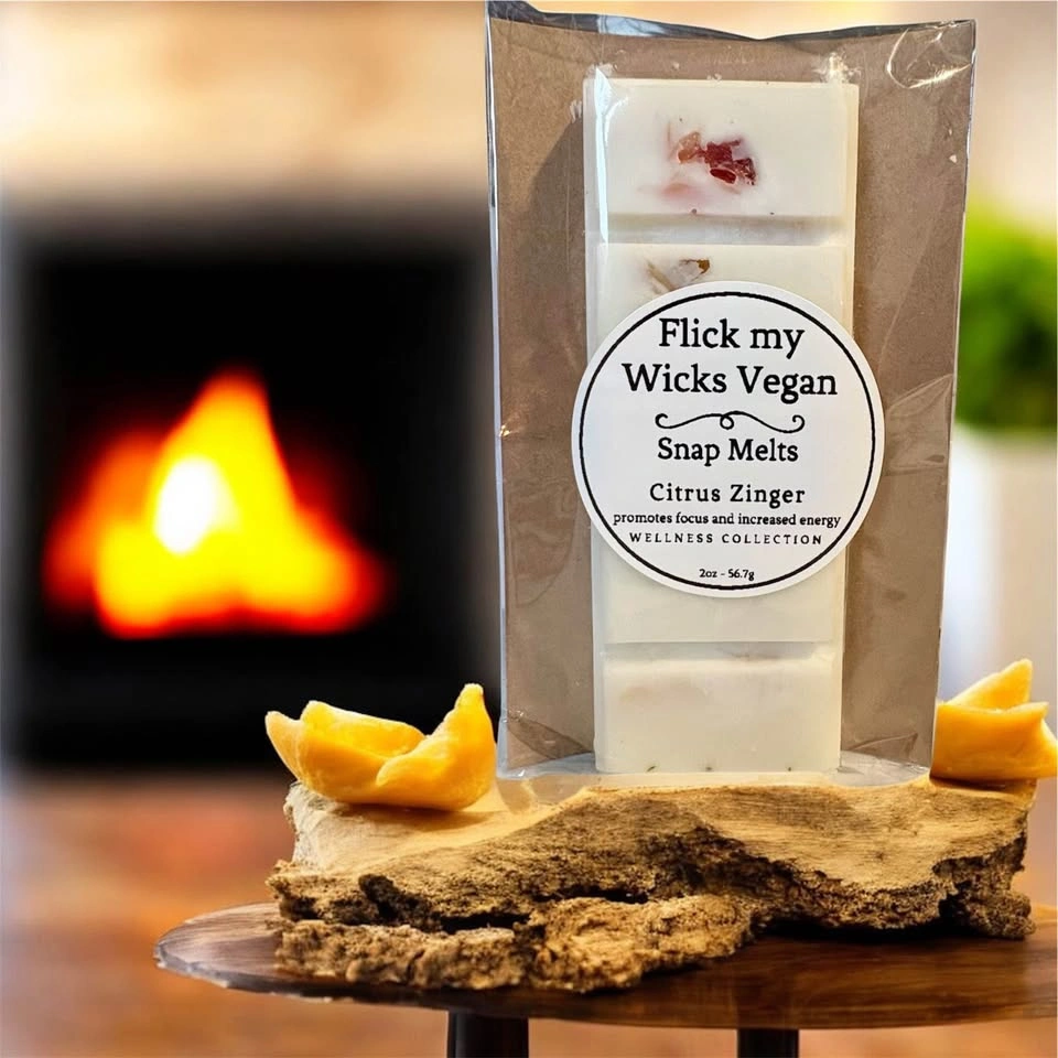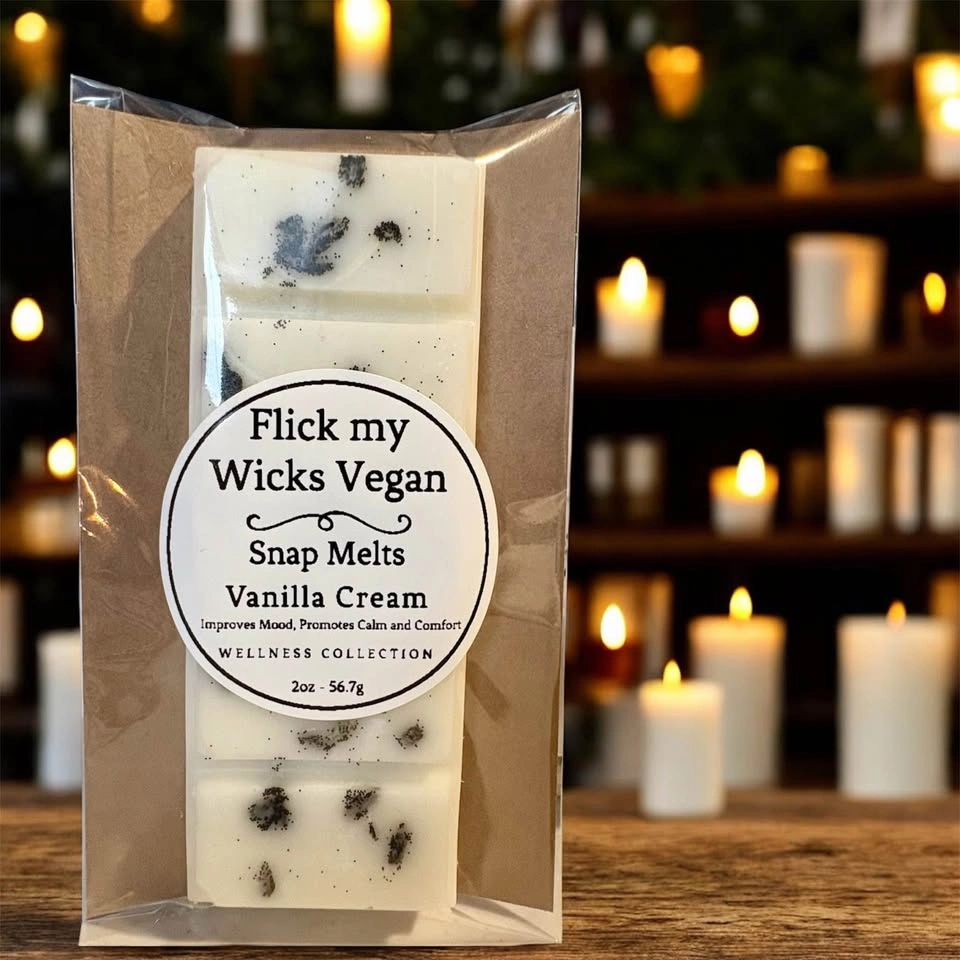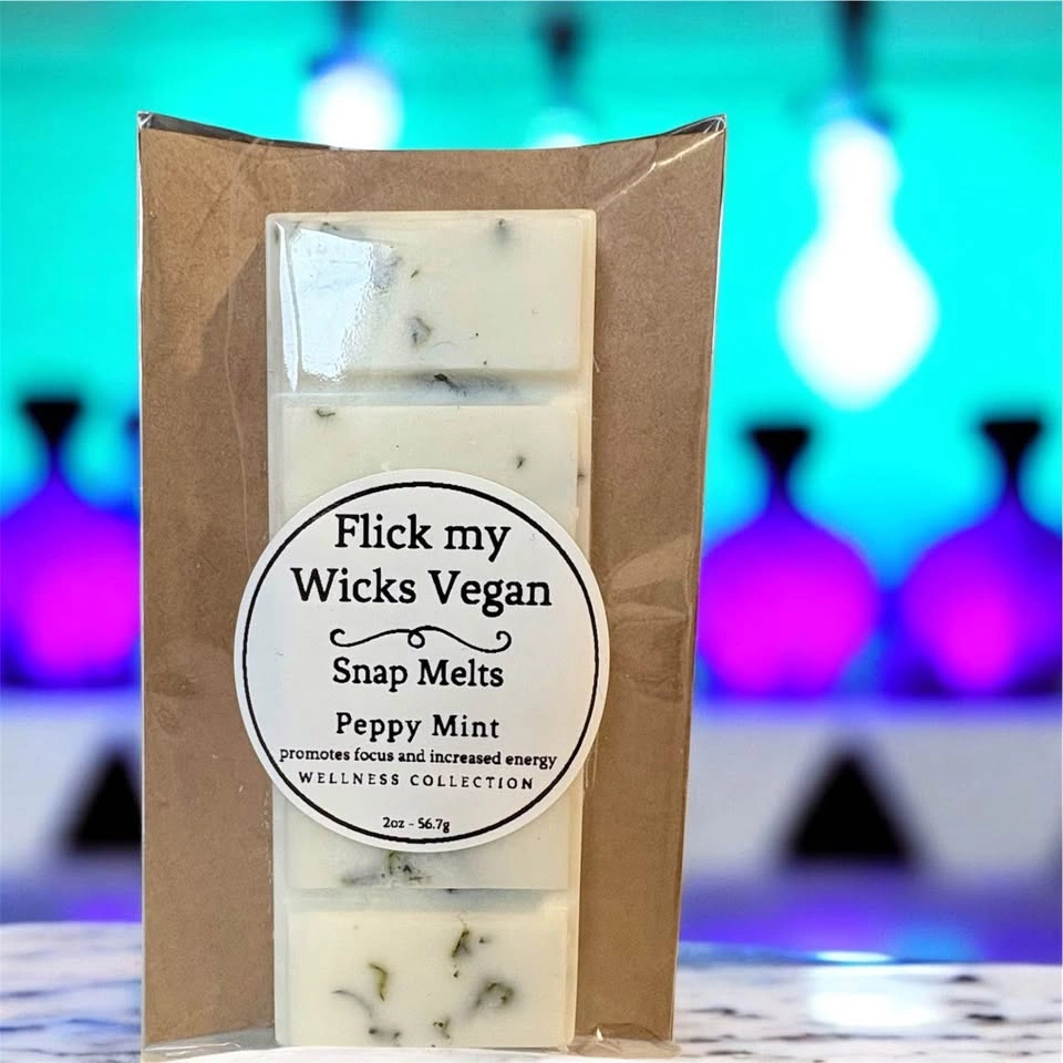 73Every Snap Melt is hand-poured with care, using 100% soy wax, phthalate-free fragrances, and eco-friendly materials. Explore my collection and bring warmth and light into your home. $8 each or two for $15 - 2oz Snap Melts Wellness Collection Vanilla Cream Improves Mood, Promotes Calm and Comfort Blanket of Roses Improves Mood, Promotes Calm and Comfort Cinnamon Bomb Improves Mood, Promotes Calm and Comfort Citrus Zinger for increased energy and focus. Peppy Mint for increased energy and focus. Looking for something unique for your next special event, please contact for pricing on bulk or custom orders. Follow @ #flickmywicksvegan flickmywicks.vegan@gmail.com