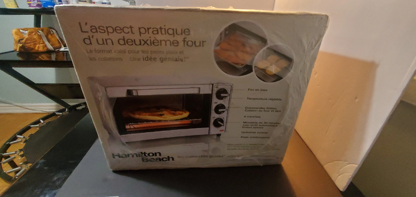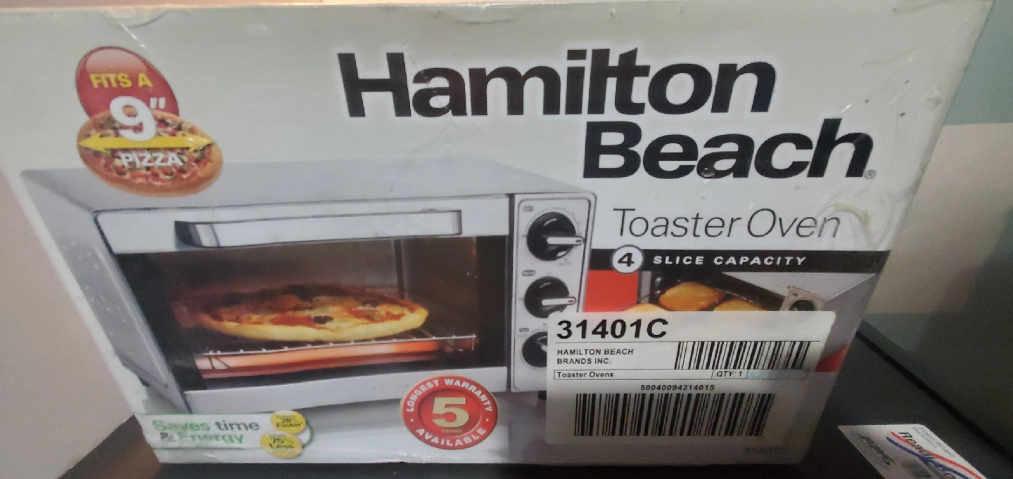 Hamilton Beach Toaster Oven. It fits a 9" pizza and has a 4 slice capacity. Model number is 31401C. Comes with the box