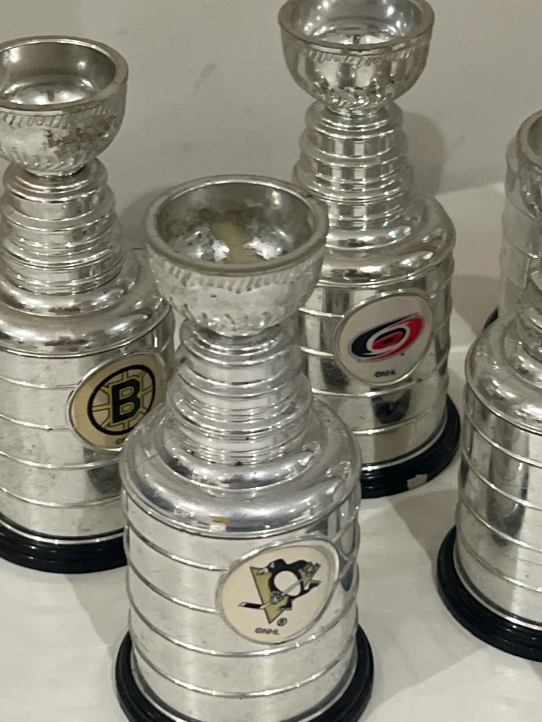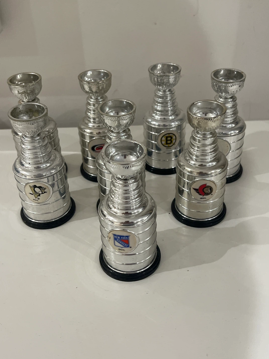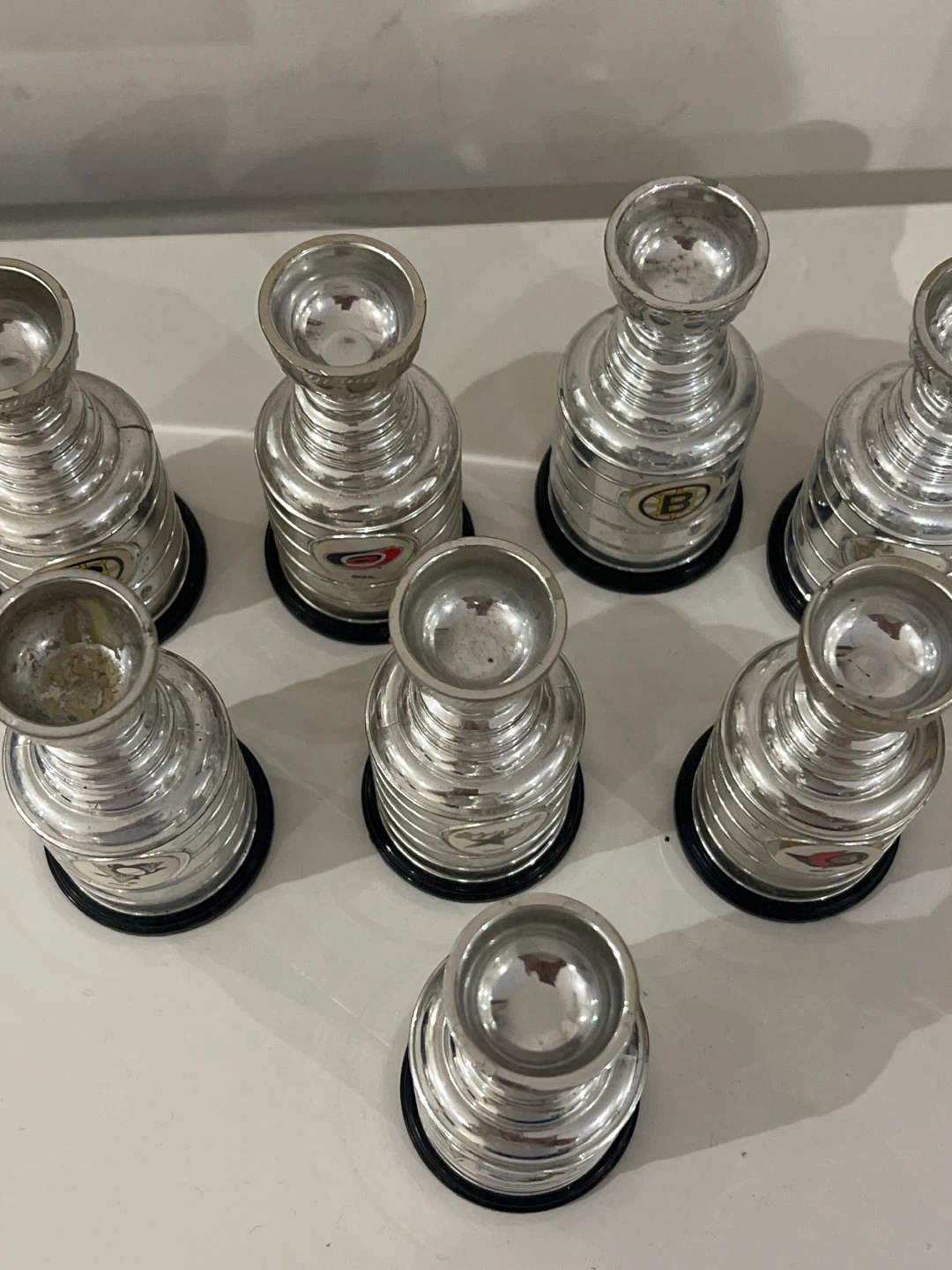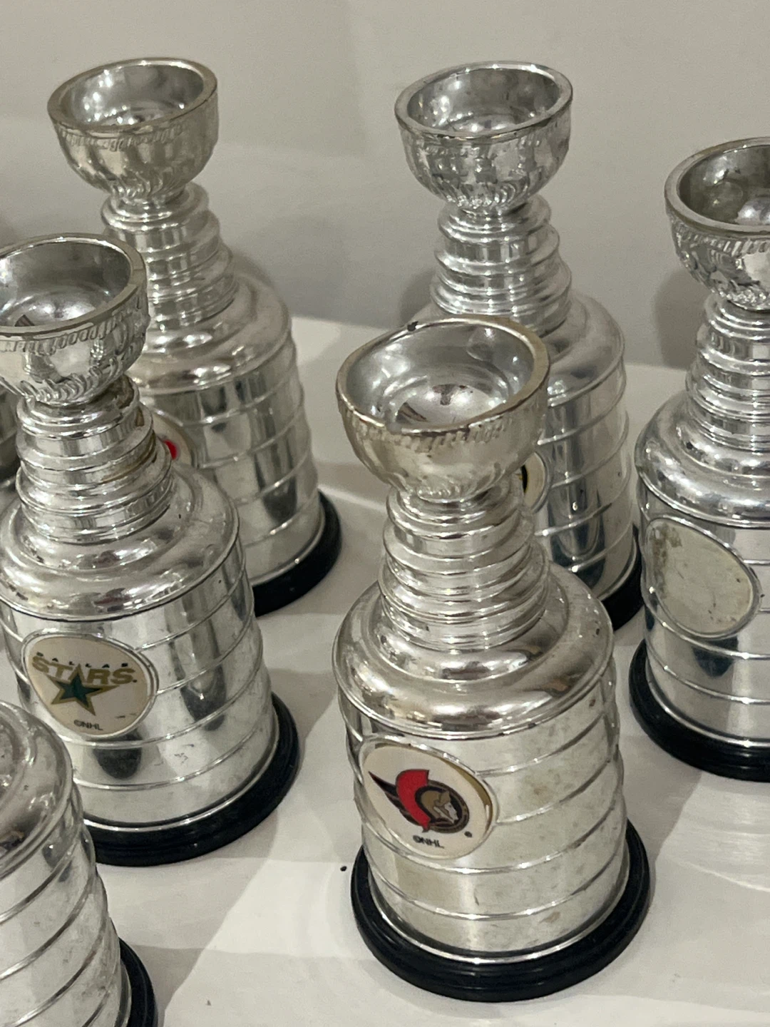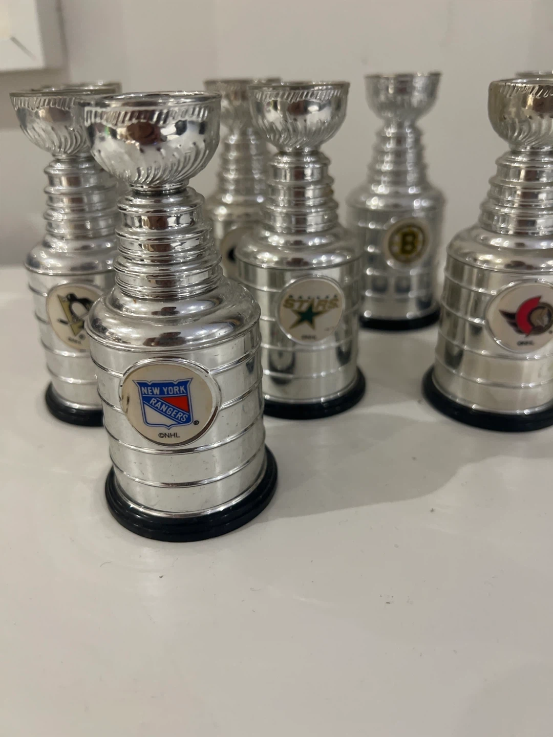 Selling a collection of miniature Stanley Cup replica trophies, each featuring a different NHL team logo. These are great for hockey fans!