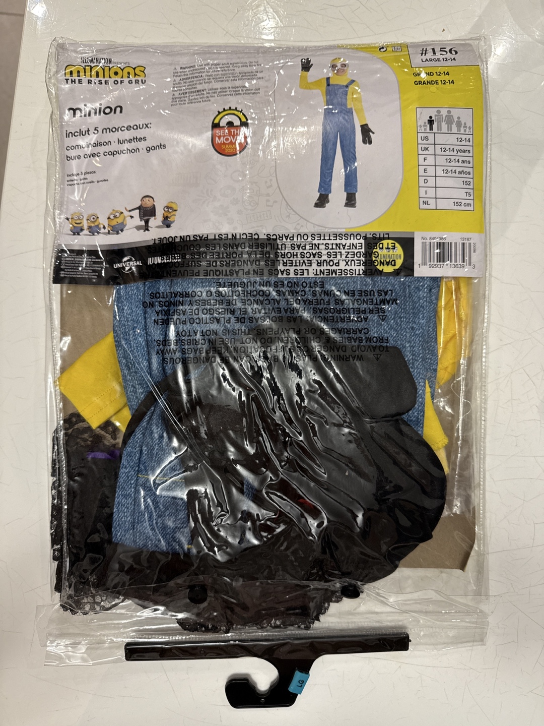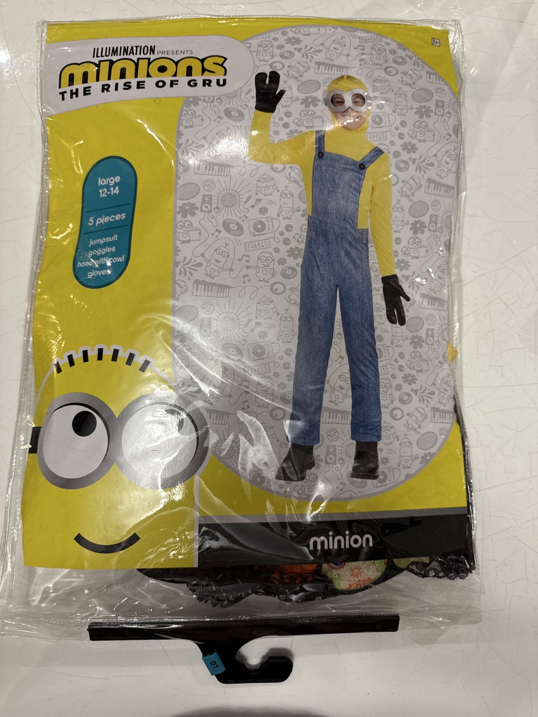 Get ready to cause some mischief with this Minions costume! It's a size large (12-14) and includes 5 pieces: a jumpsuit, goggles, hood/hair, and gloves. Perfect for Halloween or dress-up fun!