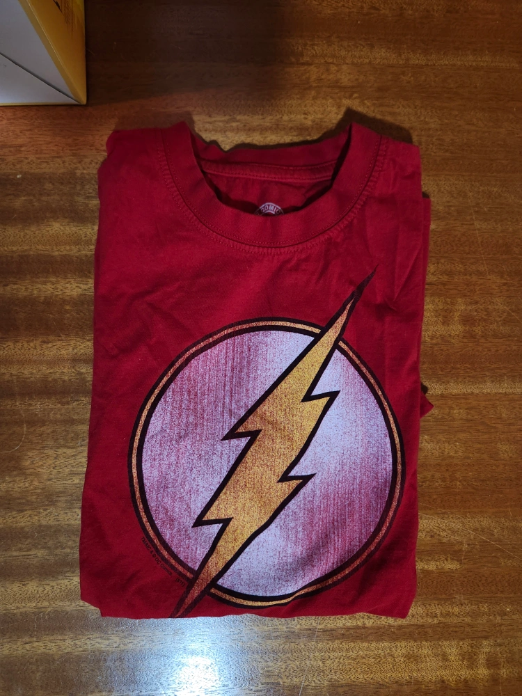 Selling a The Flash t-shirt in red! The size is L, which is equivalent to 14-16. It's made of 100% cotton, so it's super comfy. Washed but rarely worn.