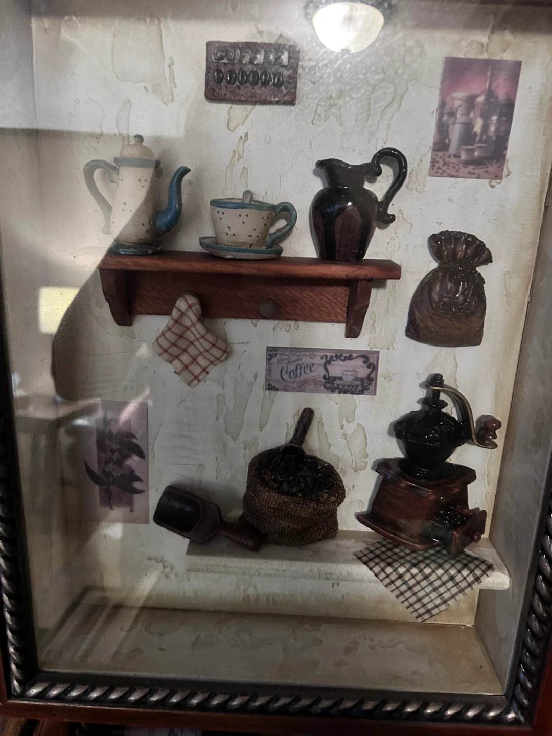 Two shadow box wall art pieces for sale! One features a coffee theme with miniature coffee pots, grinders, and beans. The other has a wine theme with bottles, books, and a delicate plate and glass. Perfect for adding a touch of charm to your kitchen or dining area