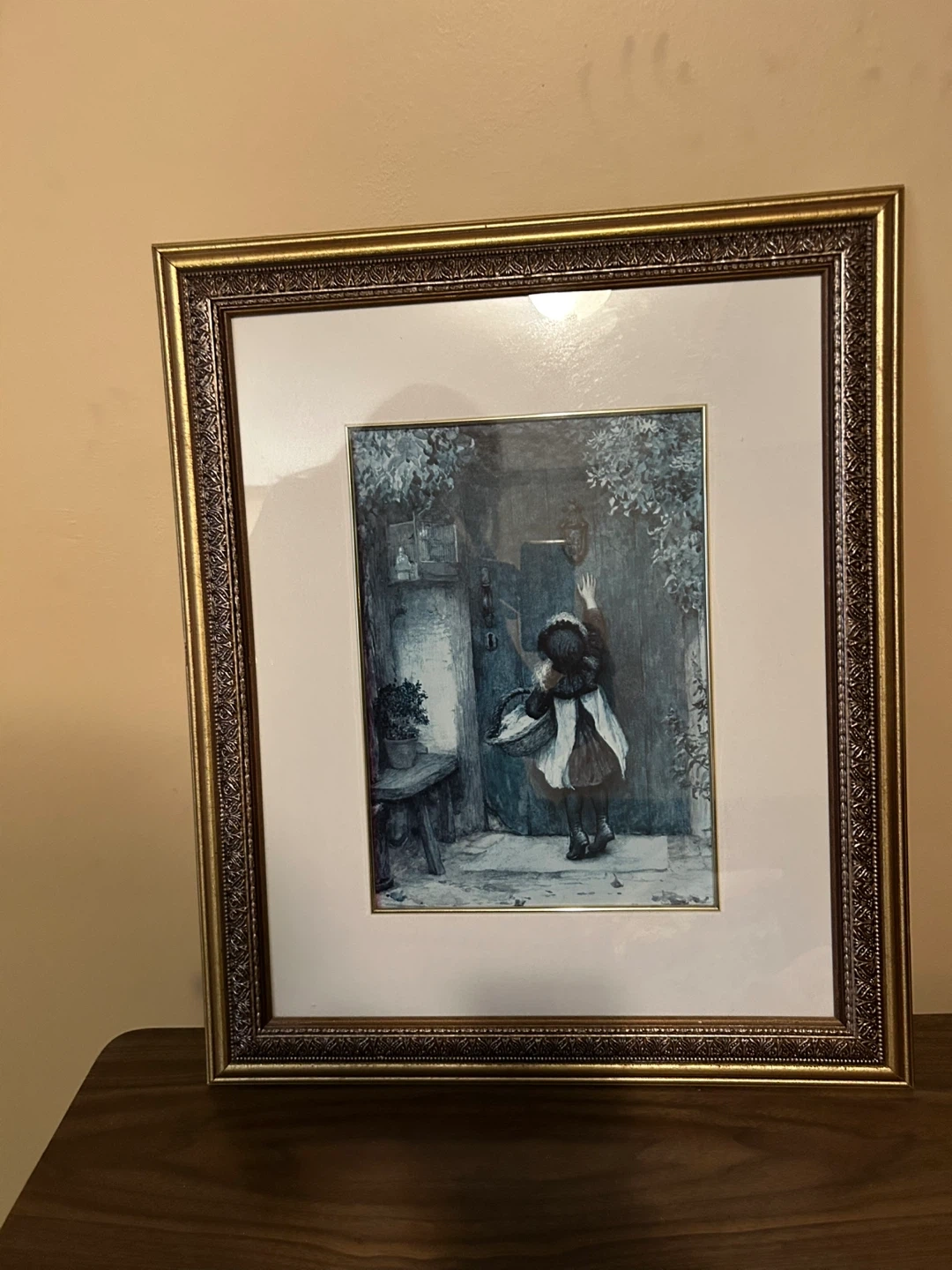 24A framed print featuring a girl with a basket. The frame is ornate and gold in colour. Perfect for adding a vintage touch to your home decor. Medium size