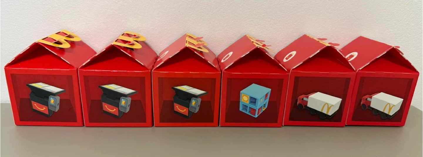 1000+Selling a collection of McDonald's Happy Meal toys. Each box contains a different toy, including a McDonald's restaurant building, a grill, a drink dispenser, and a delivery truck. Perfect for collectors or kids who love McDonald's! $6 each or 2 for $10