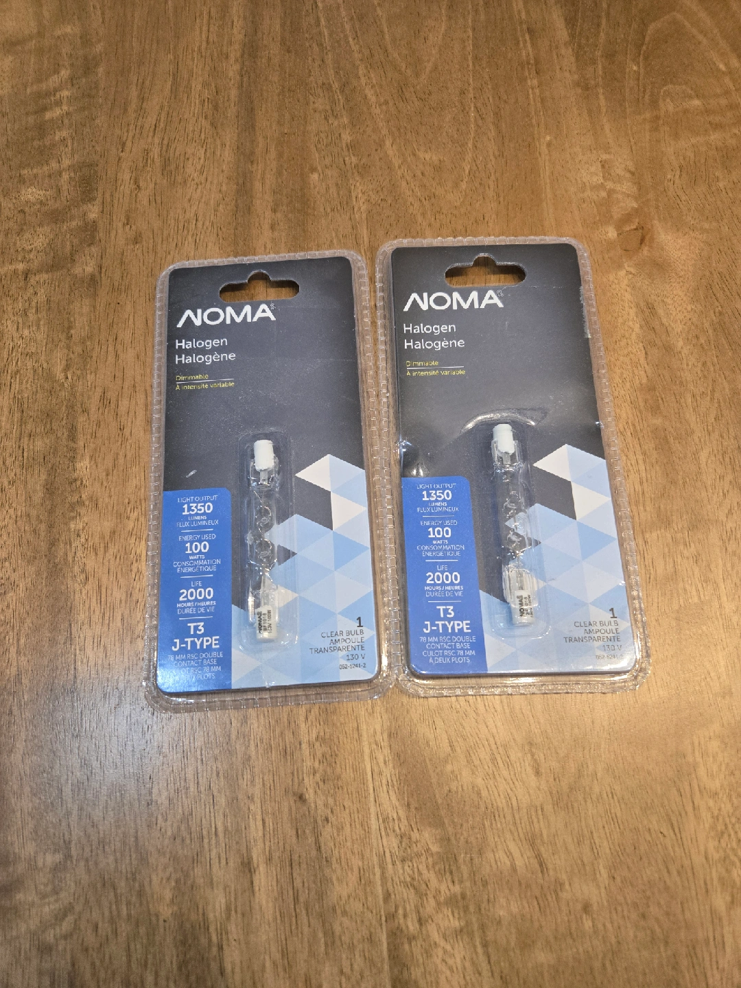 Selling two brand new NOMA Halogen T3 J-Type light bulbs! These are dimmable and have a light output of 1350 lumens. They use 100 watts of energy and have a life of 2000 hours. Each bulb is a clear bulb, ampoule transparente, and operates at 130V