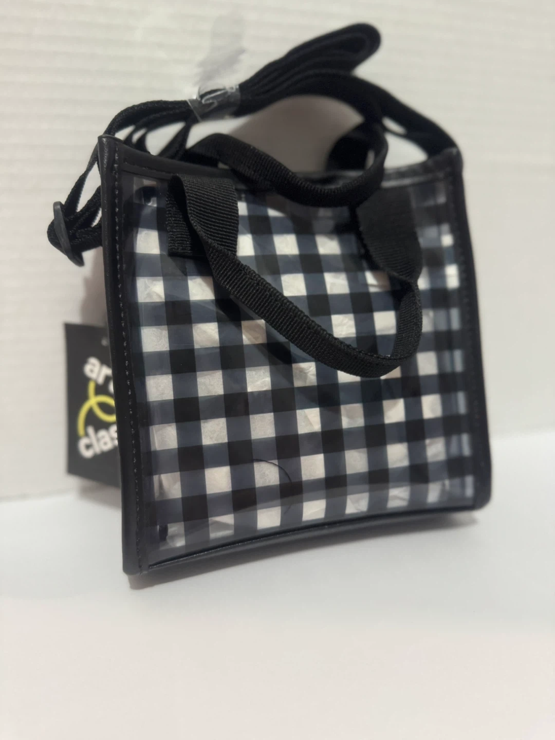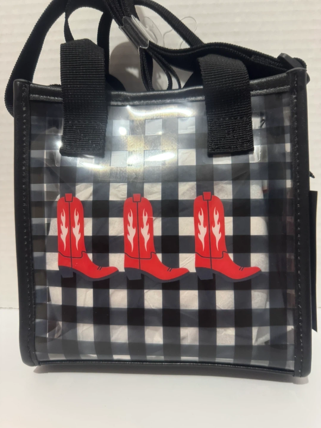 78This Art Class tote bag is brand new with tags! It features a black and white gingham pattern with three red cowboy boots on the front. It has black straps and a clear vinyl exterior. Perfect for carrying your essentials in style!