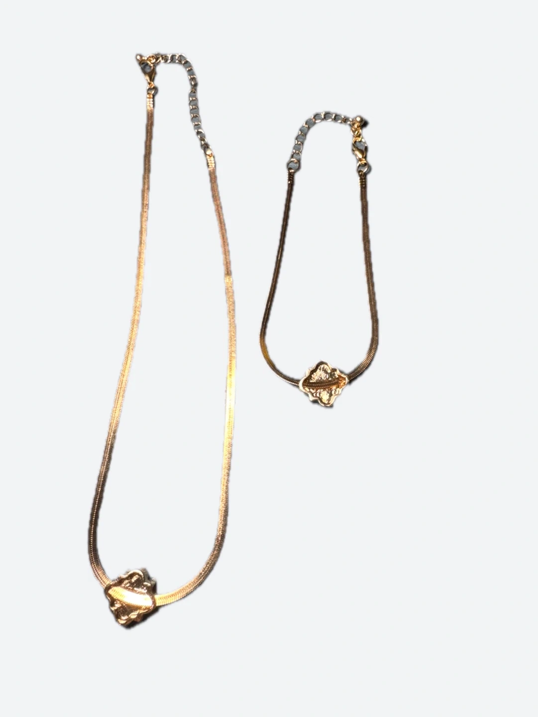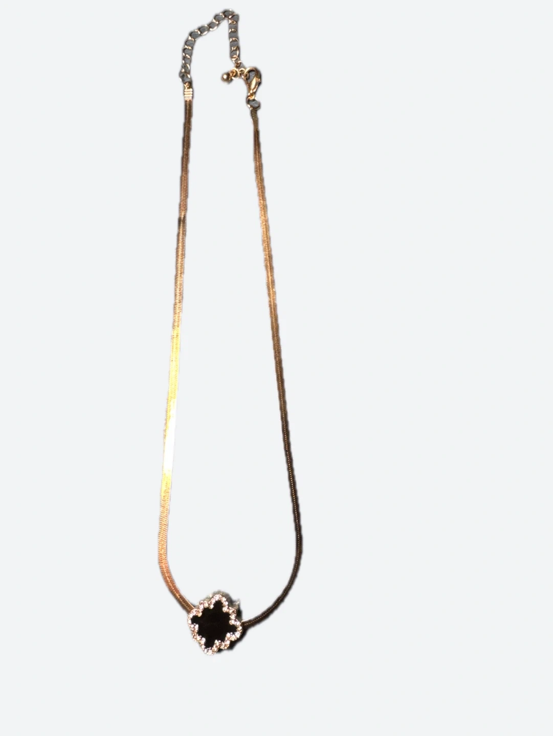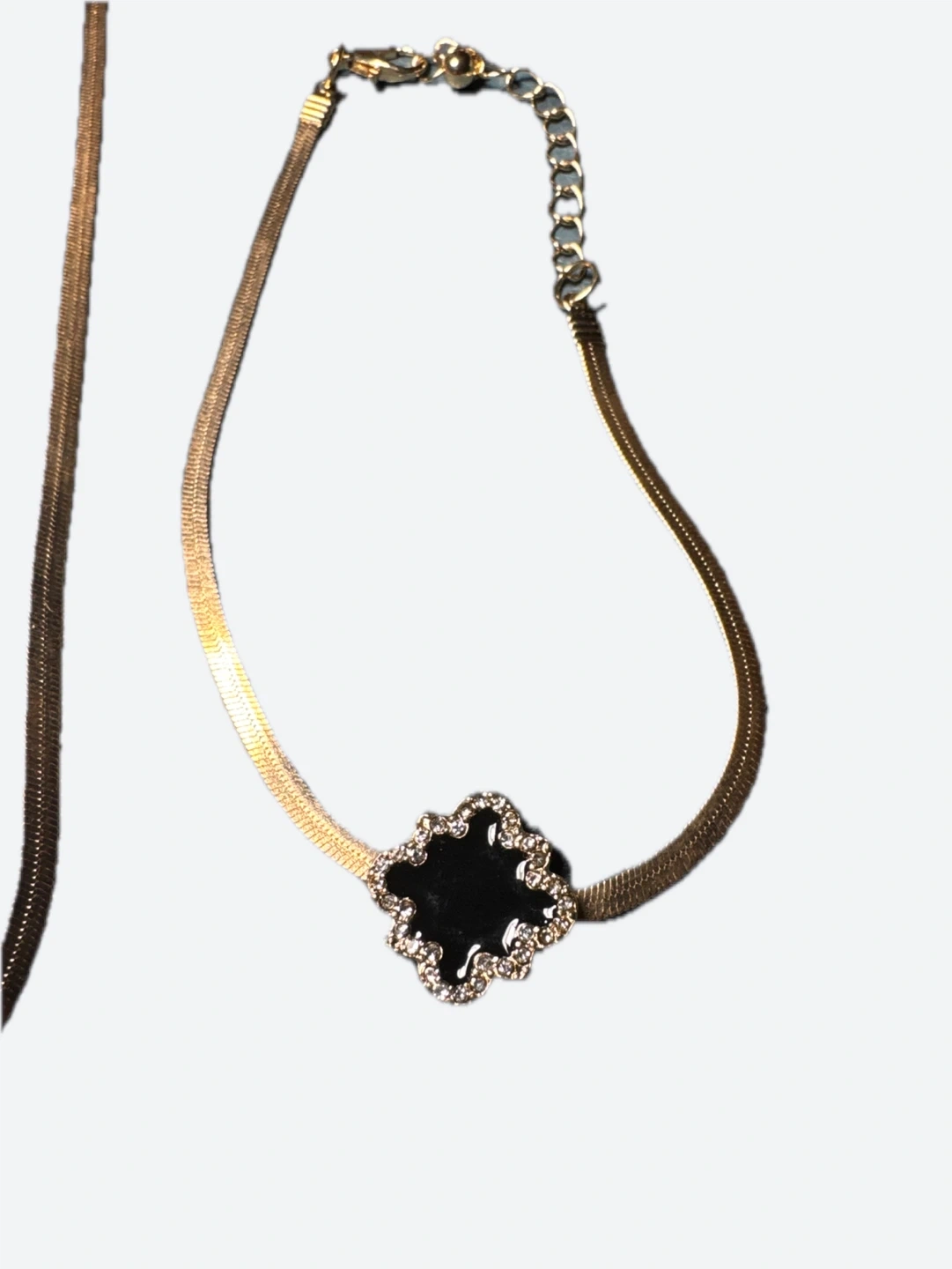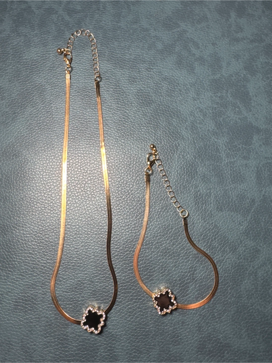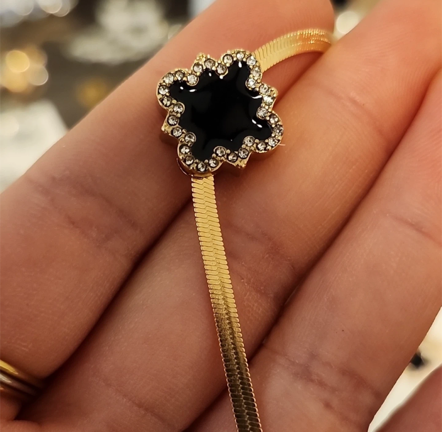 Both pieces have a gold-tone finish with a black clover design surrounded by clear rhinestones.