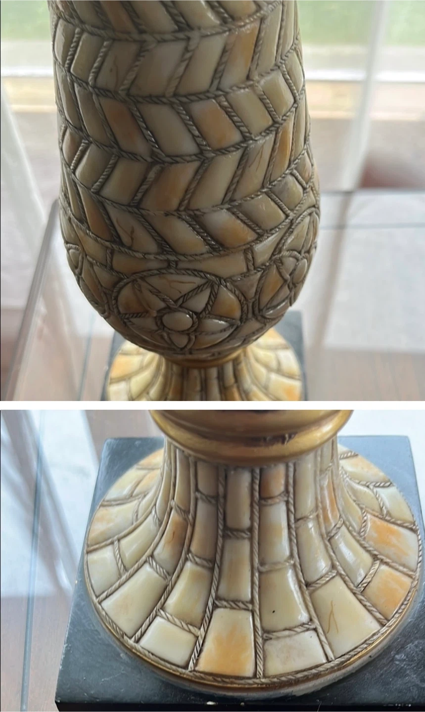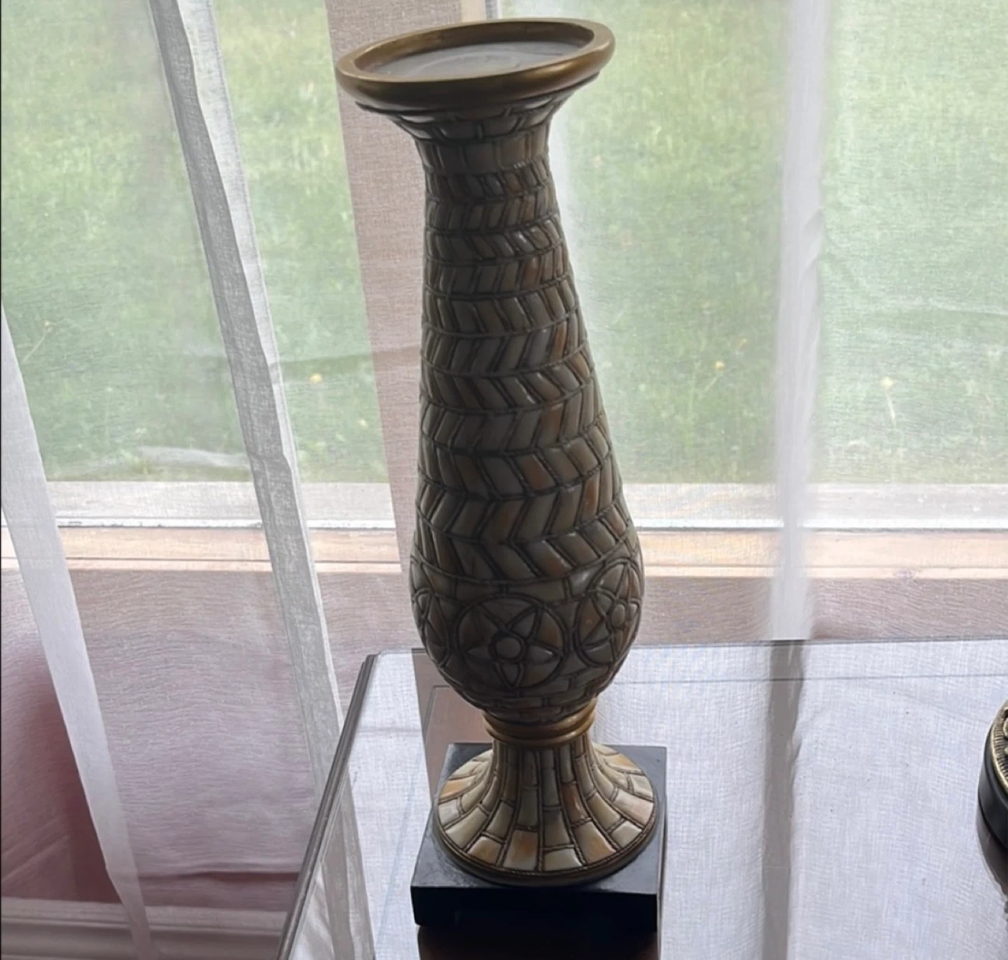 Selling a decorative candle holder from The Kinder Collection! It's in great condition and would look lovely in any room. The vase features a unique design with a black base and a textured, patterned body. It's a beautiful piece to add to your home decor