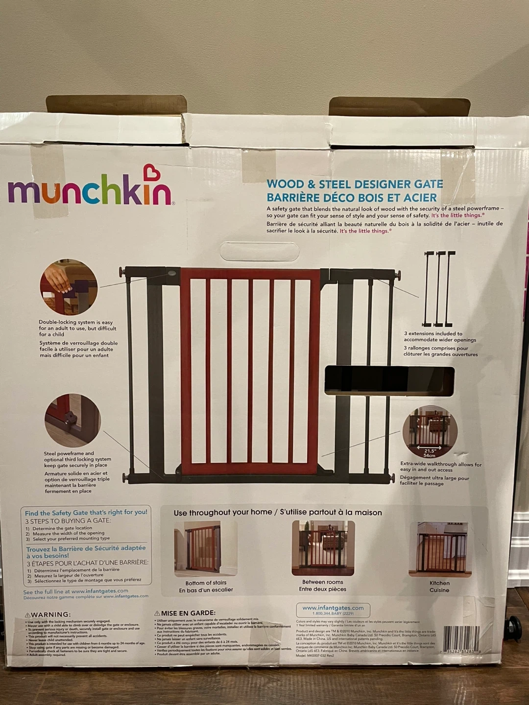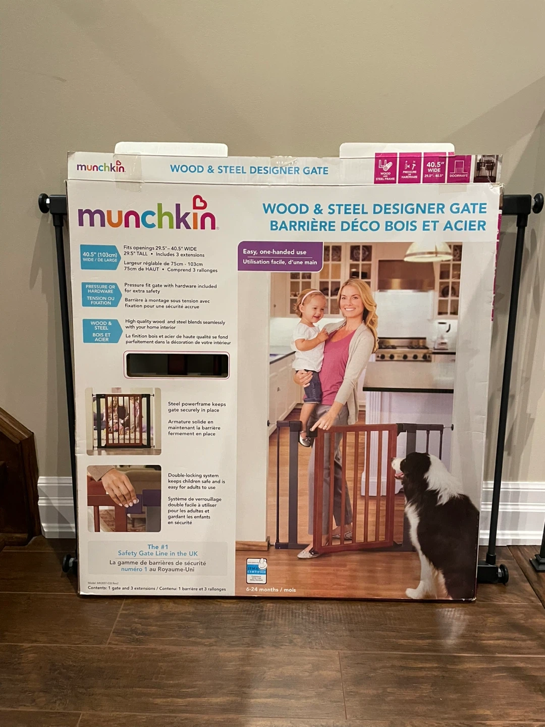 Selling a Munchkin Wood & Steel Designer Gate. It's a safety gate that blends the natural look of wood with the security of a steel powerframe.
