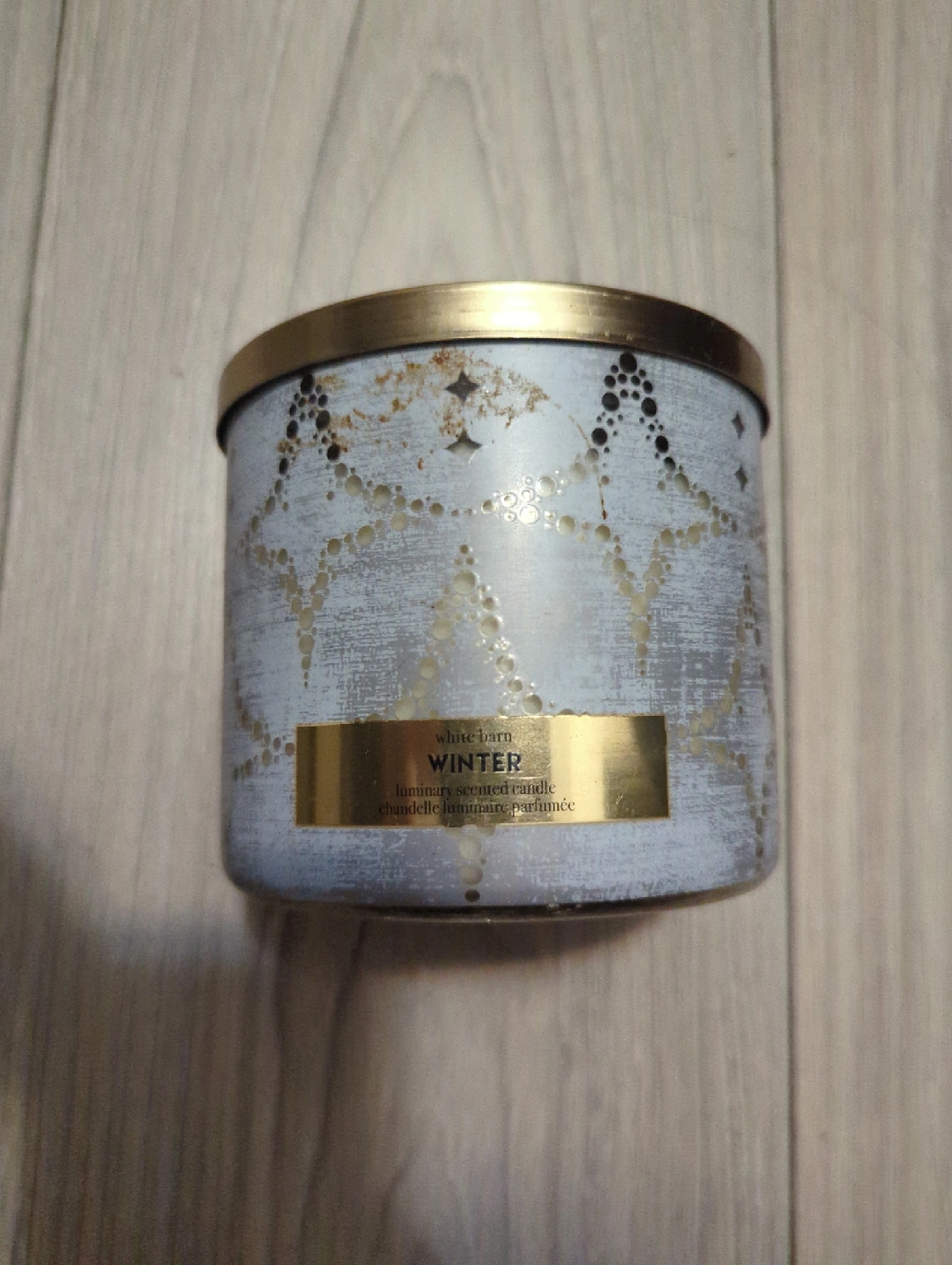 Selling a White Barn 'Winter' scented 3-wick candle! This candle has a lovely, comforting scent and would be perfect for creating a cozy atmosphere in your home. It's in great condition and ready to be enjoyed