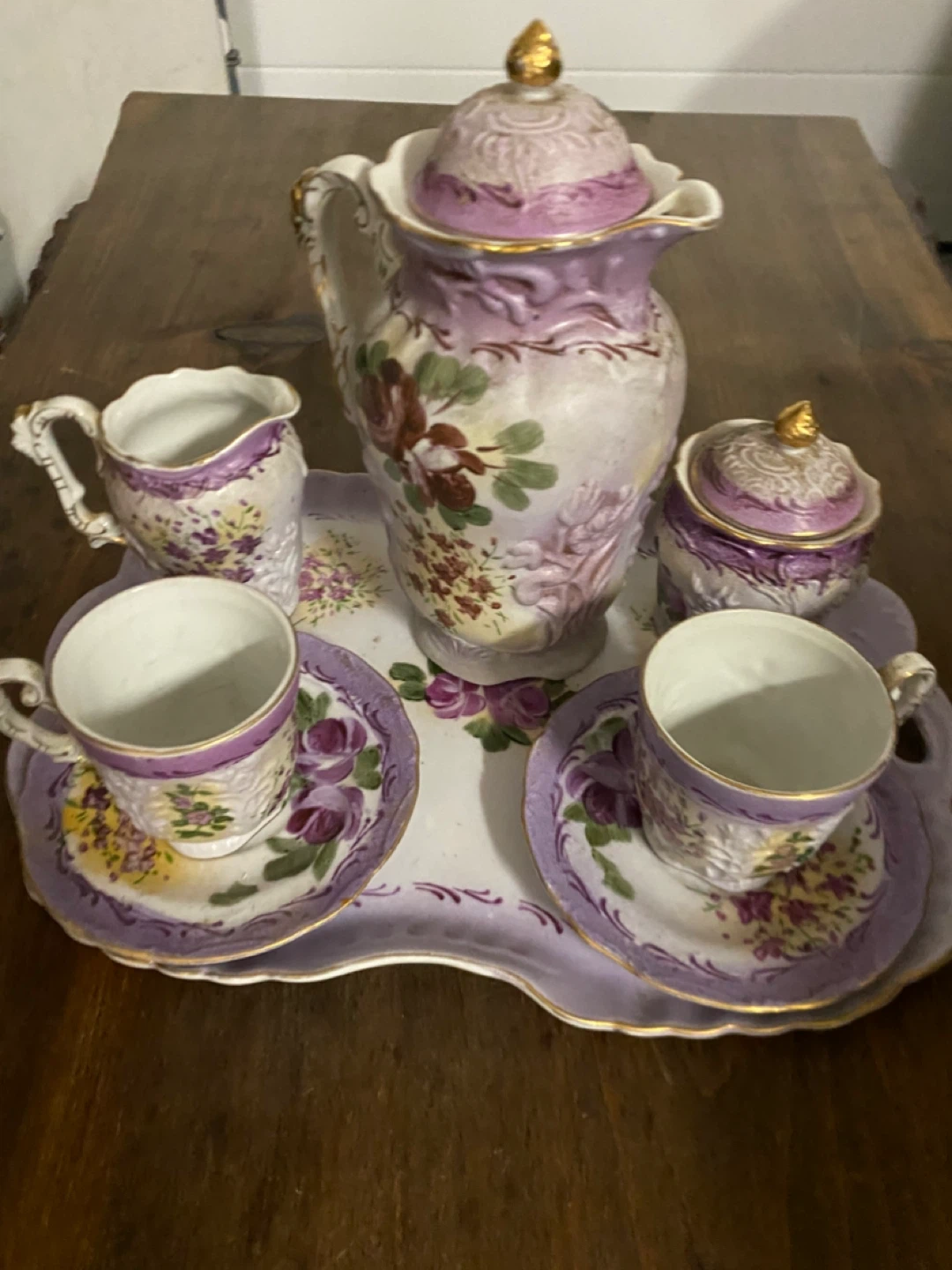 Selling a beautiful tea set! It includes a teapot, creamer, sugar bowl, two cups, and two saucers and a tray. The set features a lovely floral design with purple and gold accents. Perfect for afternoon tea or display!