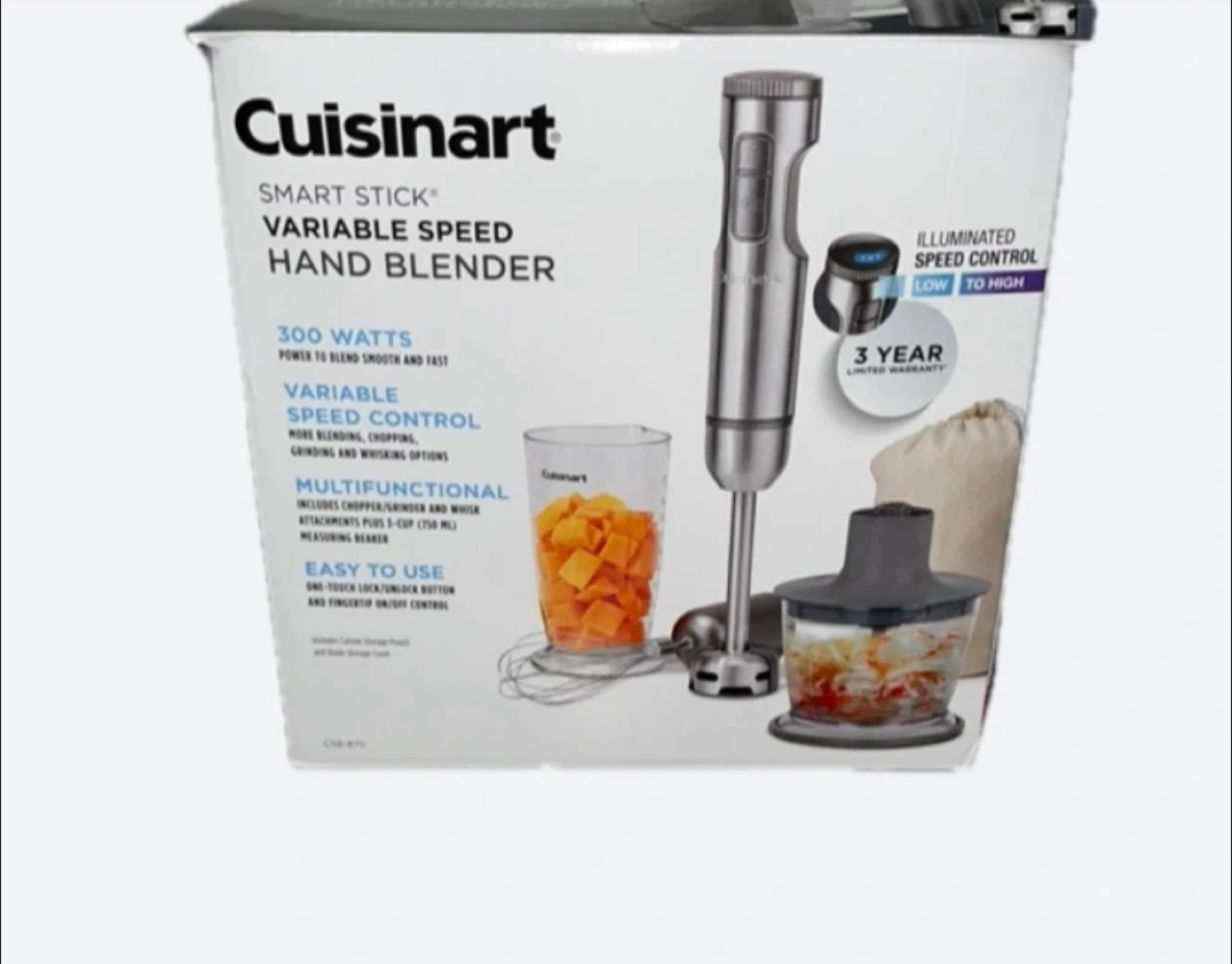 10Box is damaged but it has never been used. Items inside box are brand new. Selling a Cuisinart Smart Stick Variable Speed Hand Blender! It has 300 watts of power for smooth and fast blending. It also has variable speed control for more blending, chopping, grinding, and whisking options. Multifunctional with chopper/grinder and whisk attachments plus a 1-cup measuring beaker. It's easy to use with one-touch lock/unlock button.