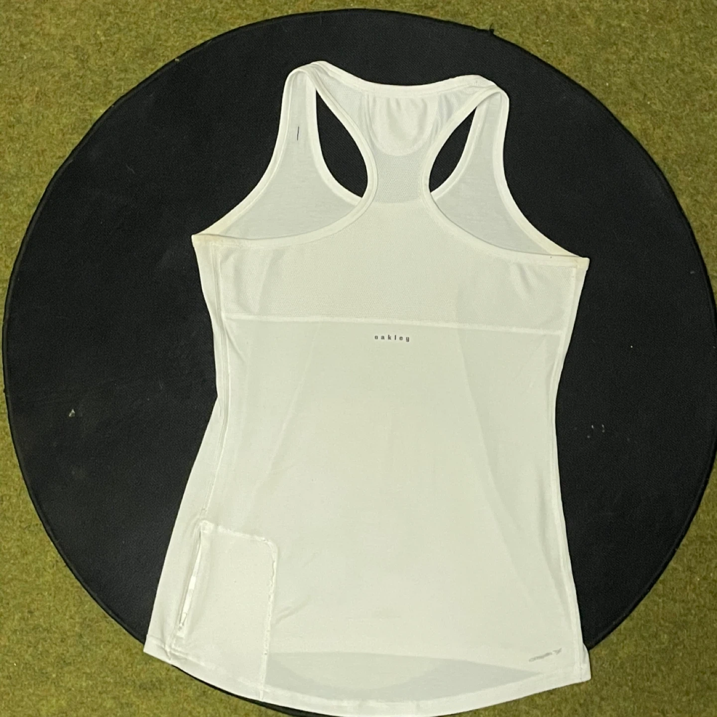 Oakley women’s white sport tank top. Brand name, features a zip pocket on the back. perfect for casual or sporty events.
