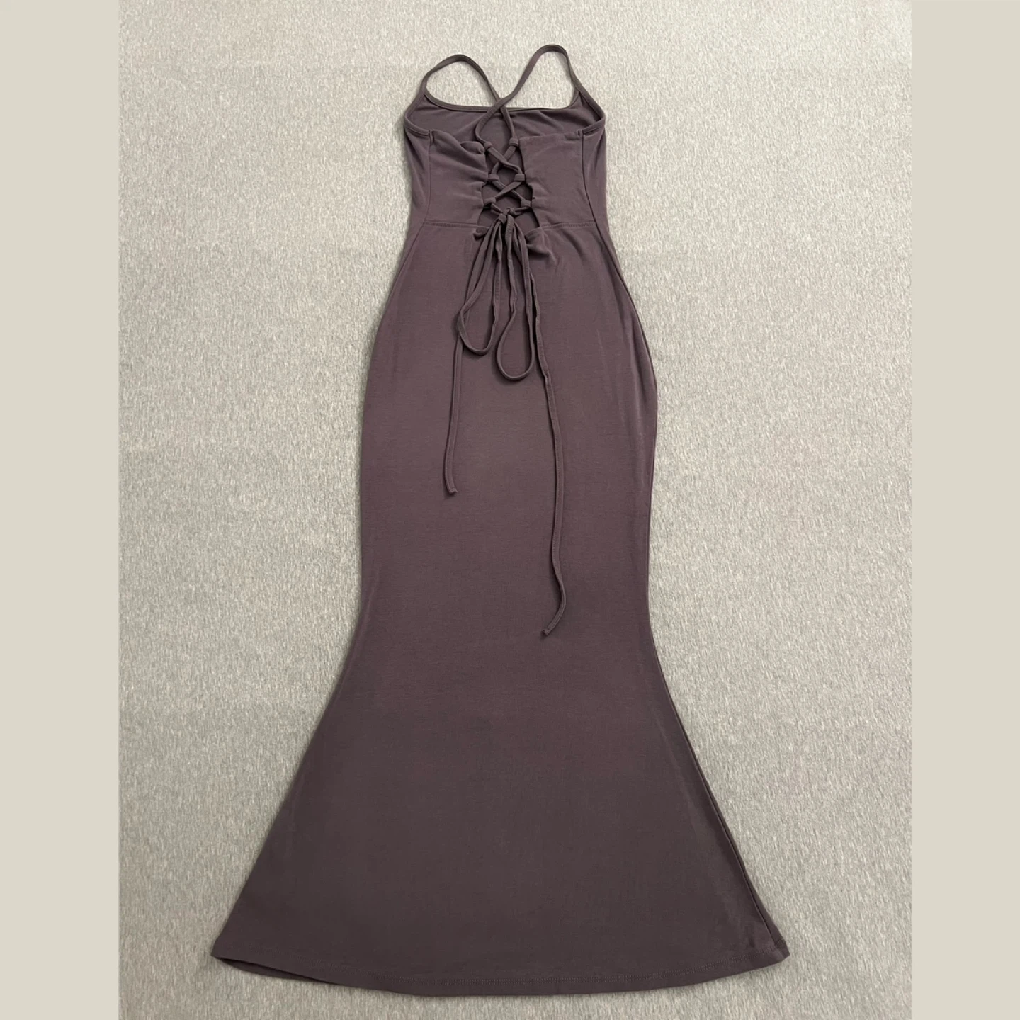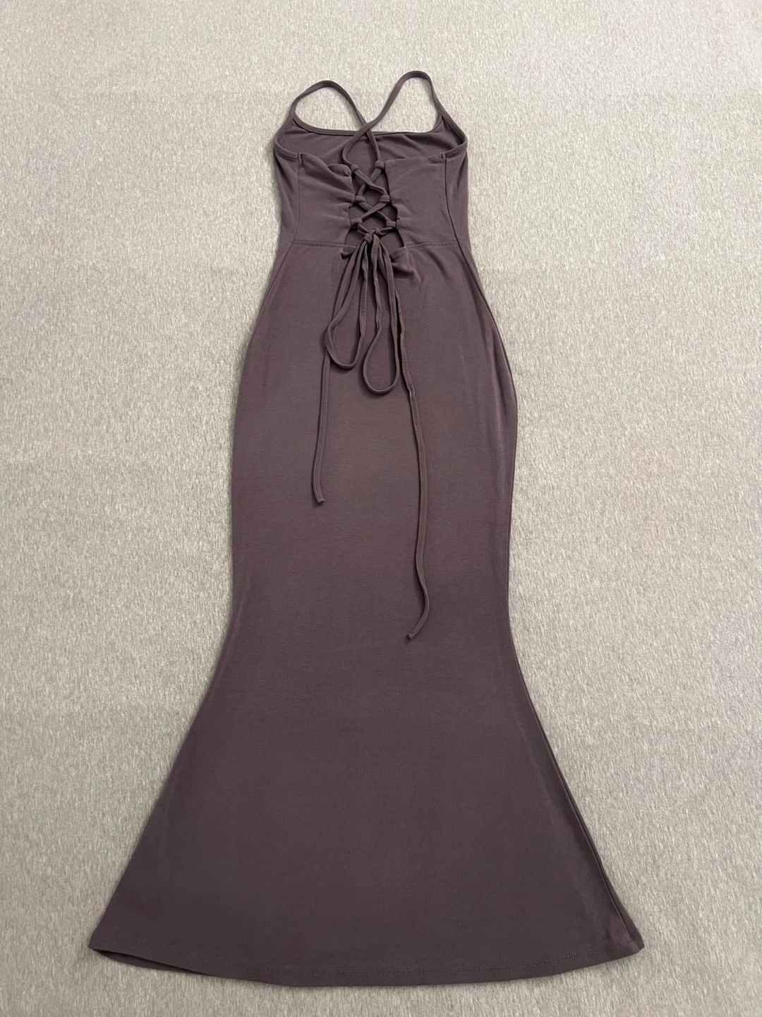 * Features: Lace-up back detail, figure-flattering fishtail cut