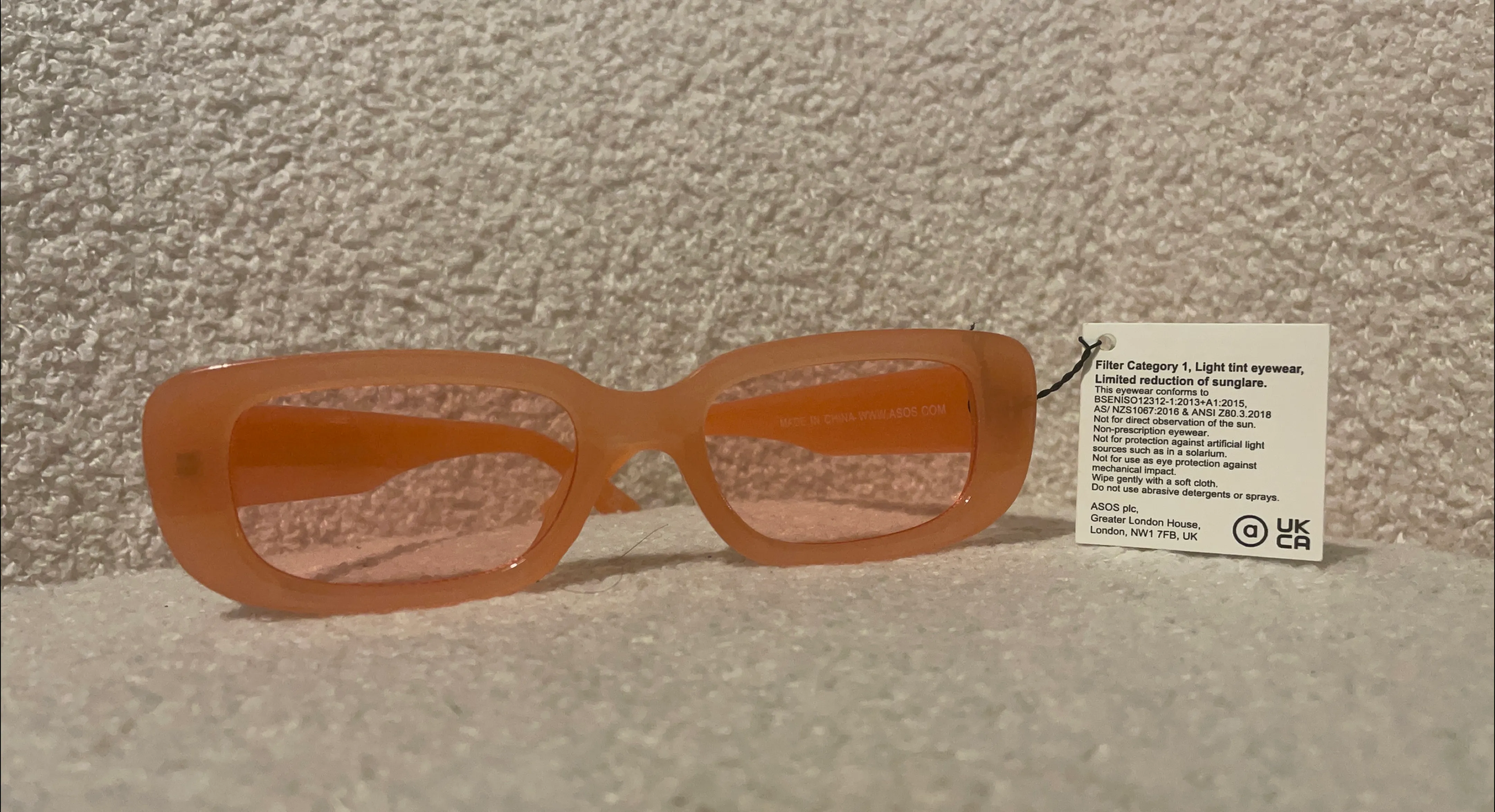 Peach tinted sunglasses from ASOS! These sunglasses are non-prescription eyewear and provide limited reduction of sunglare. They are made in China and should be wiped gently with a soft cloth. Avoid using abrasive detergents or sprays