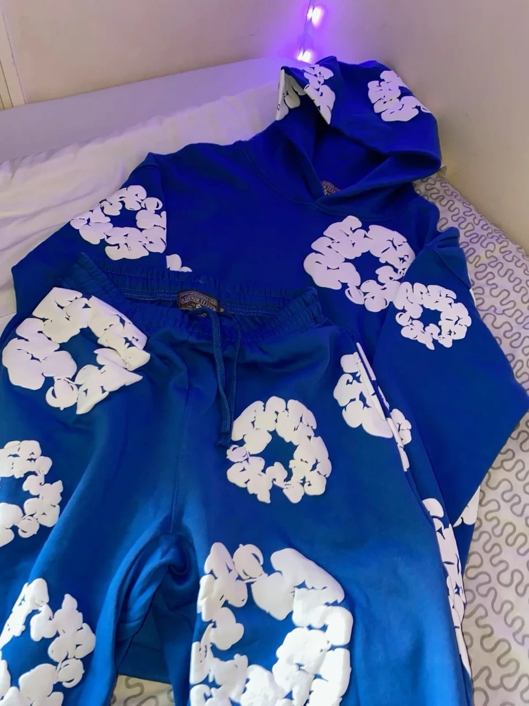 -715Here's a cool Denim Tears matching set! It includes a hoodie and a pair of sweatpants, both in a vibrant blue with unique white cloud-like designs. The material feels comfy and it's perfect for casual wear.