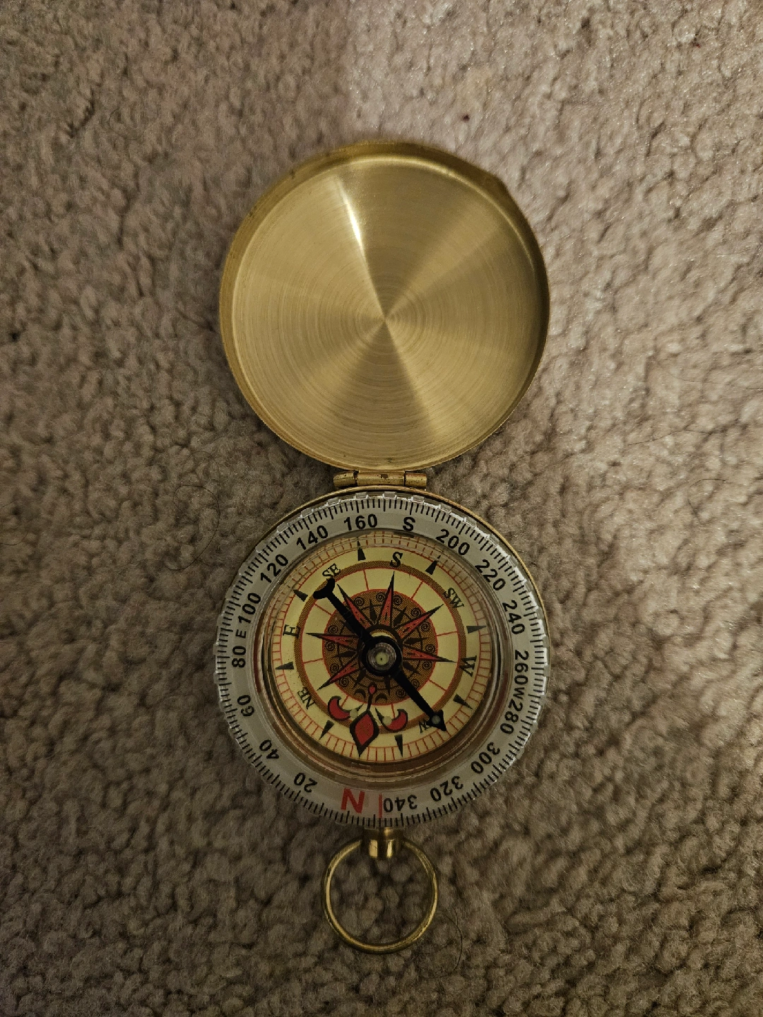143Selling a vintage-style brass compass. It's in good condition and perfect for hiking or collecting! The compass has a classic design with a clear and easy-to-read dial