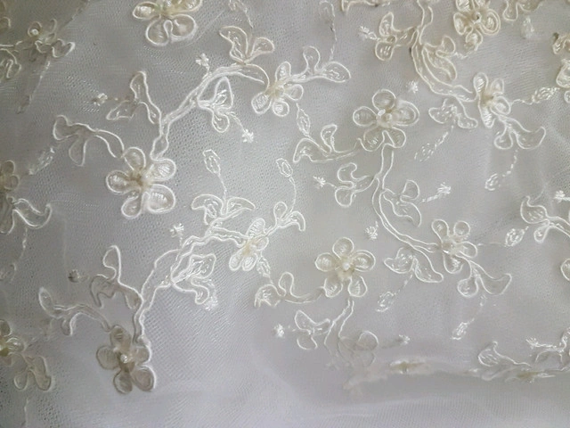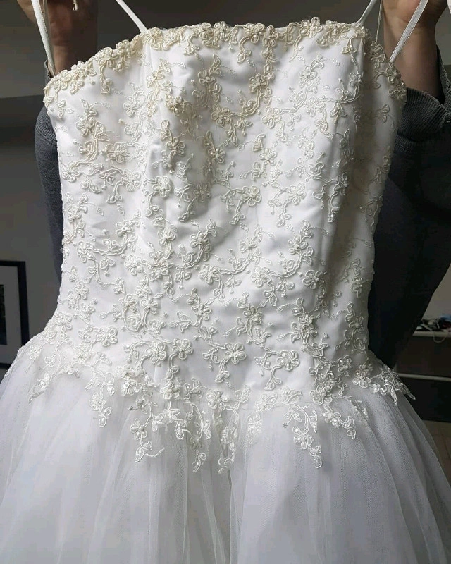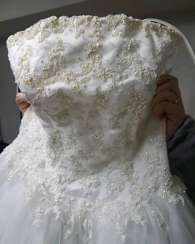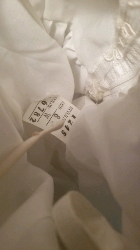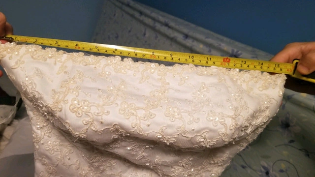15Beautiful designer wedding dress with a small, tight-fitting corset-style top. Comes with a veil. It was previously mistakenly listed as a size 6 by the previous owner, but it's marked as size 8. The bust width in the last picture is about 15 and a half inches, but that might not be the correct way to measure. Selling for a friend who's left the country. Probably just used once. Size: Medium (8-10).