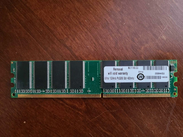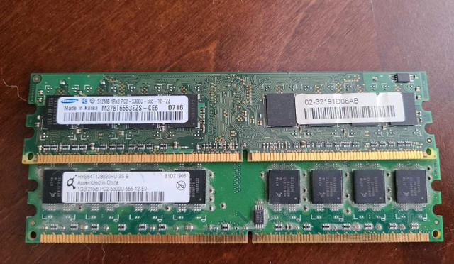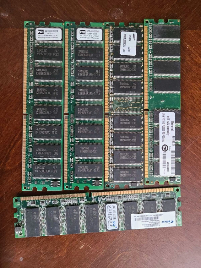 15Maybe that old server, media player or test bench PC has a free slot or two and could use some extra ram? Improve performance for an old pc with added ram and ssd drive (I don't have those for sale though). Just got some more chips. Samsung laptop DDR PC2700 CAS 2.5 one 512gb chip and one 256gb One 1gb PC2 5300 I have one pc3200 DDR 400mhz kit consisting of two matching 1024mb memory sticks. Another 512mb chip speed as above. I also have another kit with silver heatsink Ultra DDR2 pc-6400 800mhz ram 2x 1024mb . One GDDR3 1333 1gb 1.5v Ram I believe it's just regular DDR3 not sure why the G. One stick of Samsung 256mb DDR1 266mhz CL 2.5! Orange Crucial ballistics one is sold. SINGLE RAM CHIPS $8 Each matching kit is $14 Or best offer.